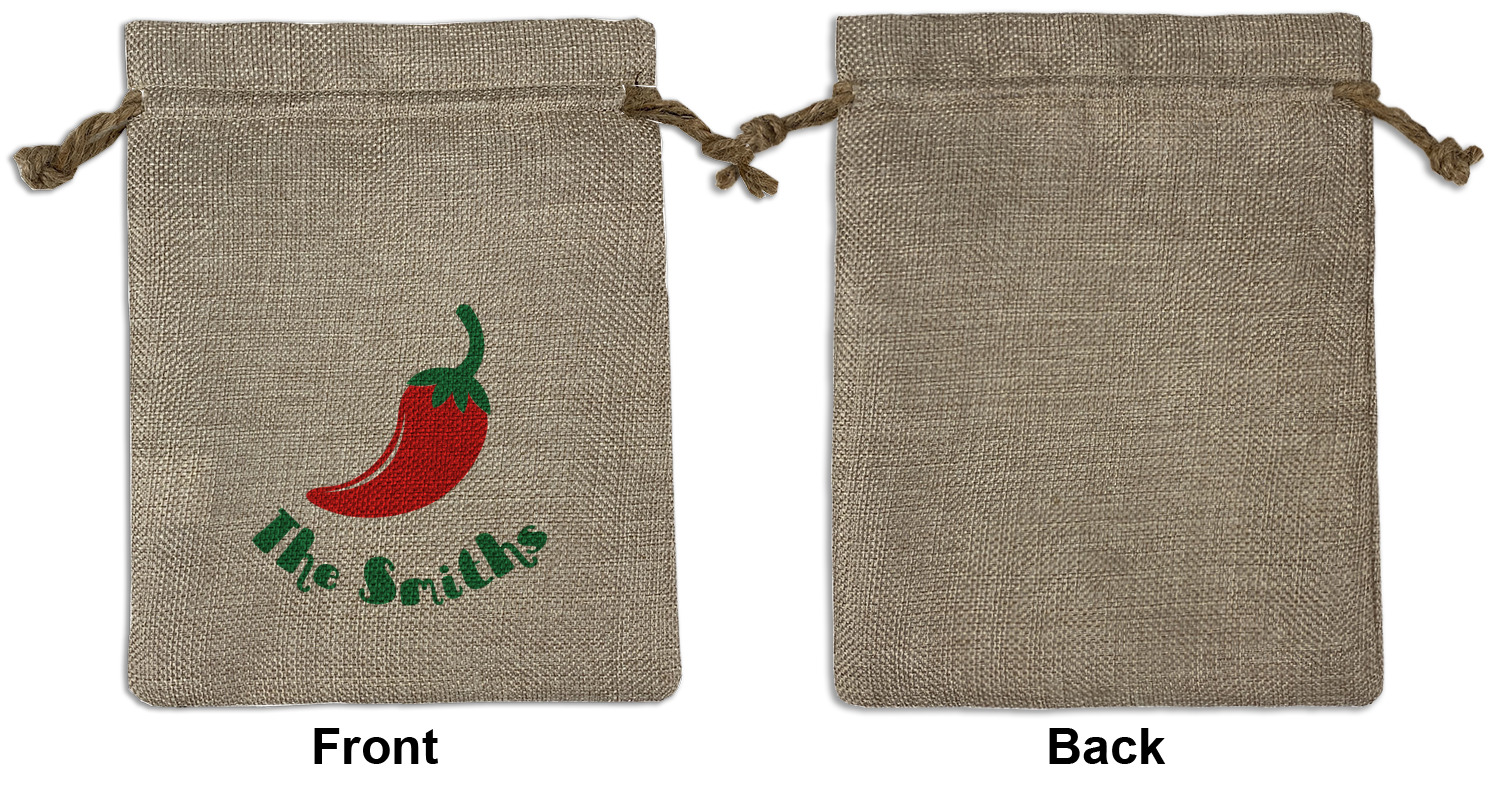 We sell our Burlap Gift Bags in 3 variant sized bags. Made with burlap polyester, each personalized bag can be secured with a twine drawstring pull. Your custom design is available to print on one side or both sides - completely up to you! The sizes of the bags measure approximately 4.5" x 6.5" for the smallest size, 6.5" x 8.0" for the medium size, and 6.5" x 13.5" for the large-sized bag.