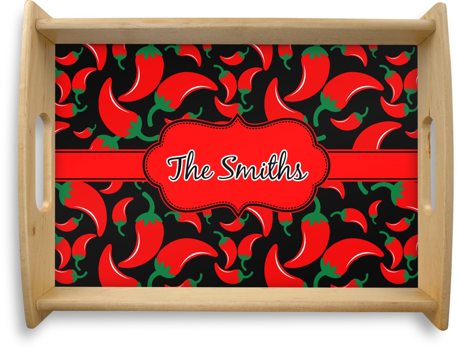 This serving tray with handles features square edges and two rounded sides, creating a very modern look. Each side is fabricated from a beautifully cut, natural wood. The bottom of the interior of the tray displays your customized design in bright, vibrant color. The tray is sold in both a black color and a natural wood look. Each variation of the wood serving tray has two sizes: Small, which is 14" x 10" x 2.25", and Large, which is 19.5" x 13.5" x 2.75".