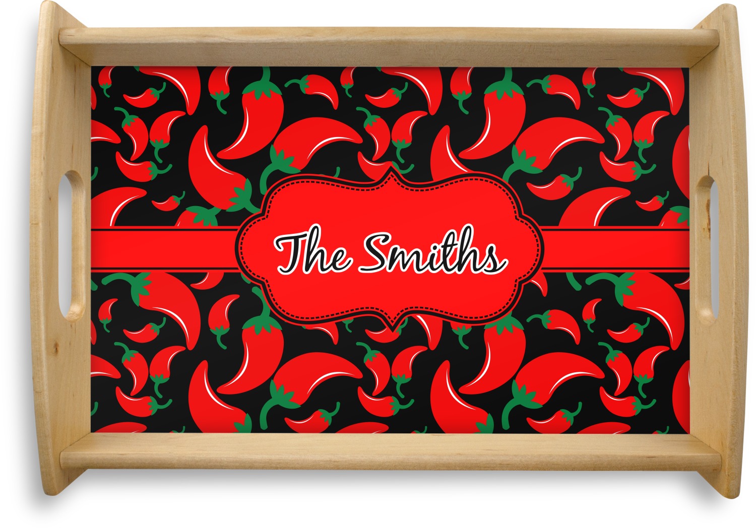 This serving tray with handles features square edges and two rounded sides, creating a very modern look. Each side is fabricated from a beautifully cut, natural wood. The bottom of the interior of the tray displays your customized design in bright, vibrant color. The tray is sold in both a black color and a natural wood look. Each variation of the wood serving tray has two sizes: Small, which is 14" x 10" x 2.25", and Large, which is 19.5" x 13.5" x 2.75".