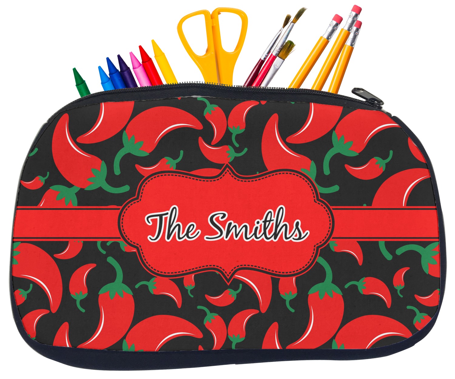 Built from durable neoprene, these pencil pouches, are water resistant, and prevent leaking ink from spilling into your backpack or purse. These custom pencil cases secure with a robust, black zipper. We print your personalized design on the front of this pouch, while the remaining sides a simple black color. These colored pencil cases [880] are sold in two sizes; our smaller version measures at 8.5 by 4.5 inches, while the medium measures at 10.5 by 6.5 inches. The smaller size is more suitable for holding pencils and pens, while our medium size can accommodate pencil sharpeners, scissors, and erasers.
