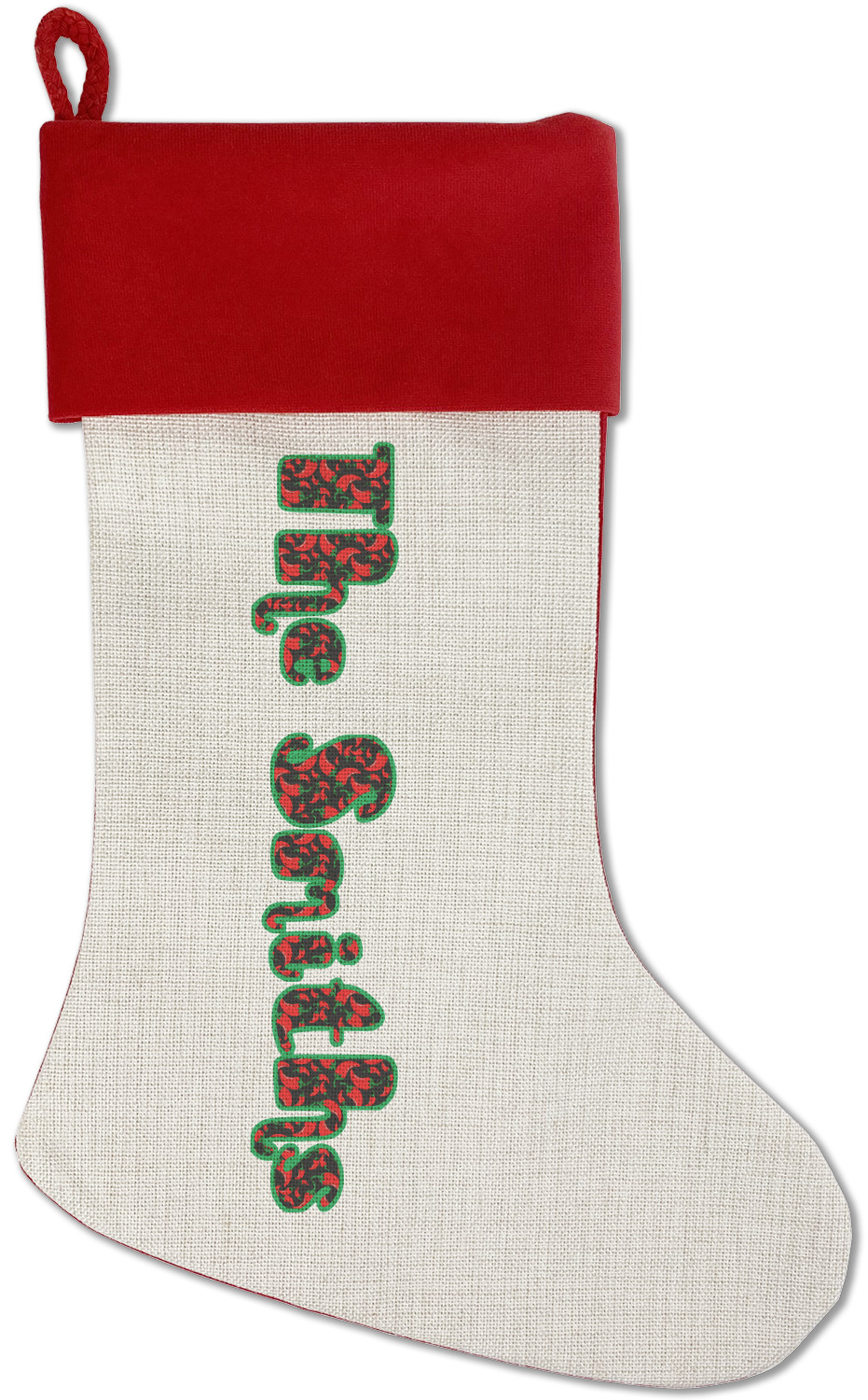Our classic red stockings are made from a soft, yet durable polyester material perfect for any stocking stuffer! The front of our Christmas stockings have a linen front that boldly displays your custom design accented with a lush red cuff resting all around the stocking. Each stocking is approximately 18x12 with a durable cotton rope loop for hanging.