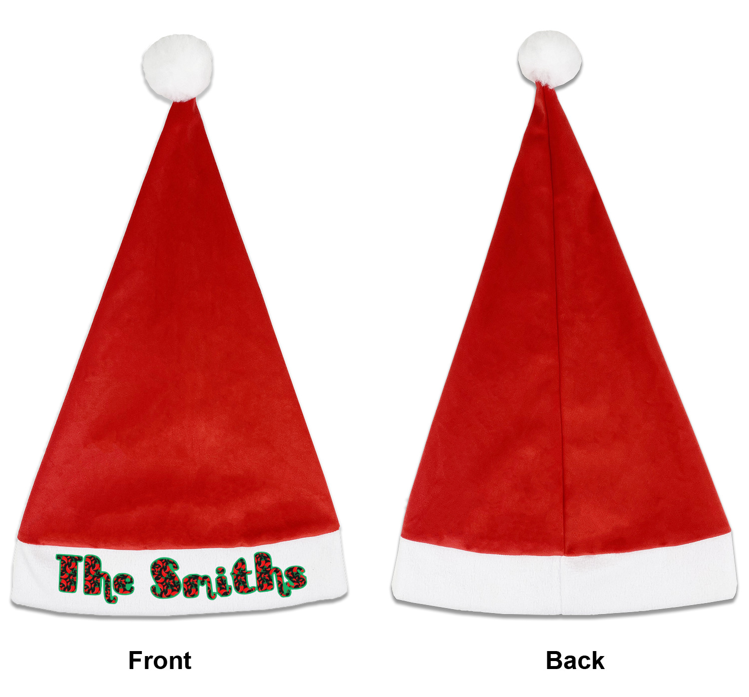 Our Santa hats are a soft, velvety polyester material. These customizable Santa hats are a classic red with white brimming and pom pom ball hanging off the hat tail just like Santa Claus! Each personalized Santa hat is approximately 17.5 L x 11.8 W. We offer two different styles to print your designs on the white brim - front or front & back.