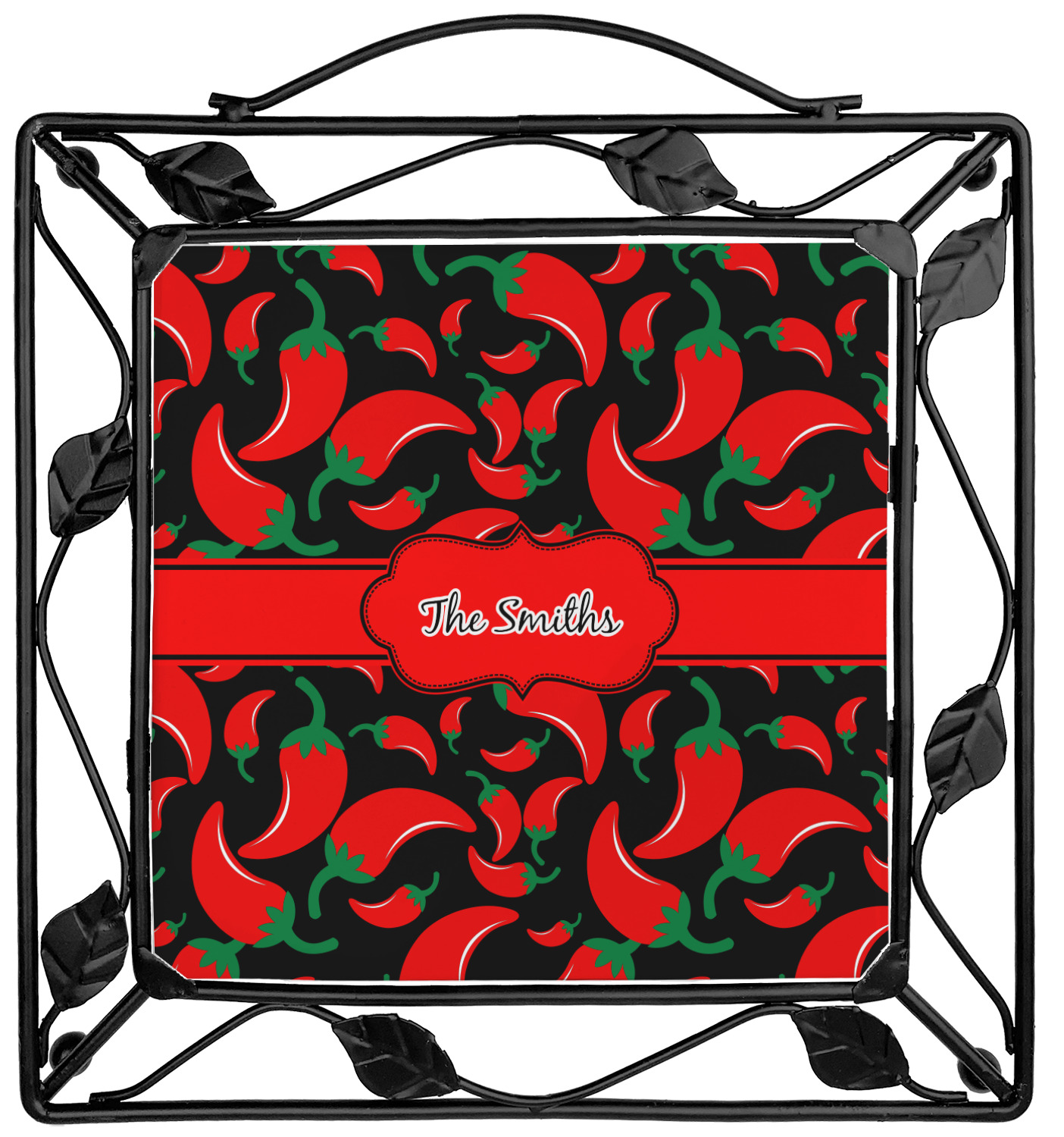 Our square trivets are made from a durable, wrought iron. This model features 4 small half circles, one on each corner, and a larger ring of iron that circles the central, customized tile. Each of the 4 corners has a round foot on its bottom for stability. This trivet is 8.75 by 8.75 inches, but the central tile measures at 6 inches on both sides.