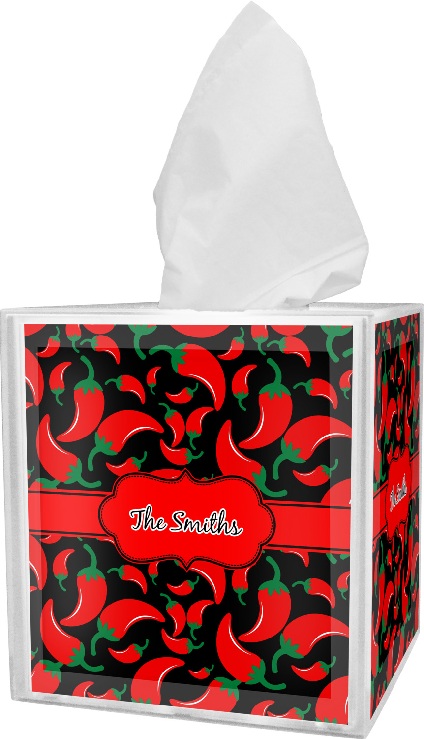 These tissue holders are built from durable acrylic and display your unique personalization on fine-quality vinyl inserts placed within the four sides and top. The box features two pieces, allowing you to easily switch out tissue boxes. On the sides, youll find ridges that ensure the top and base fit securely in place. The bottom of these tissue box holders has four, rubber, non-slip pads to prevent the box from scuffing any surface you decide to display it on. Each box can fit a standard 5 by 5-inch box of tissues.