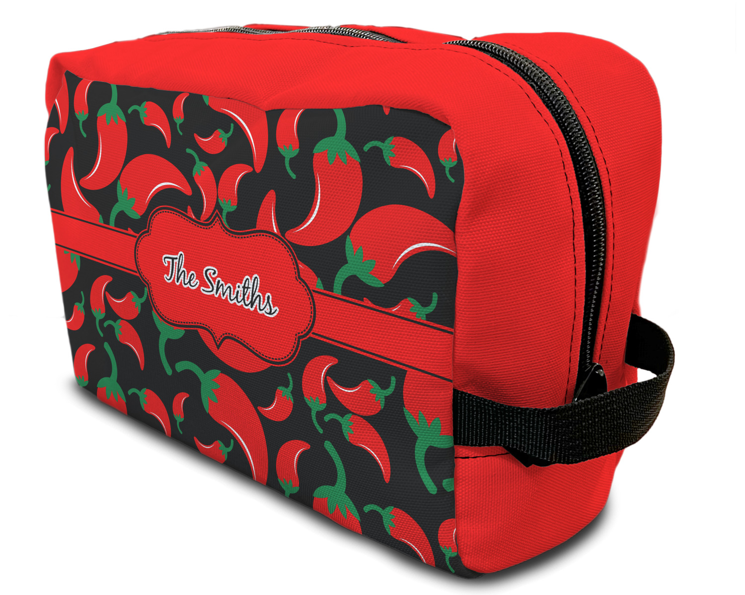 Our toiletry bag has the traditional dopp kit design i.e. a side to side zippered closure, giving you easy access to all the contents inside and a sturdy handle on one side of the bag. The canvas fabric for dopp kits is printed, then cut and sewn here in the USA.
