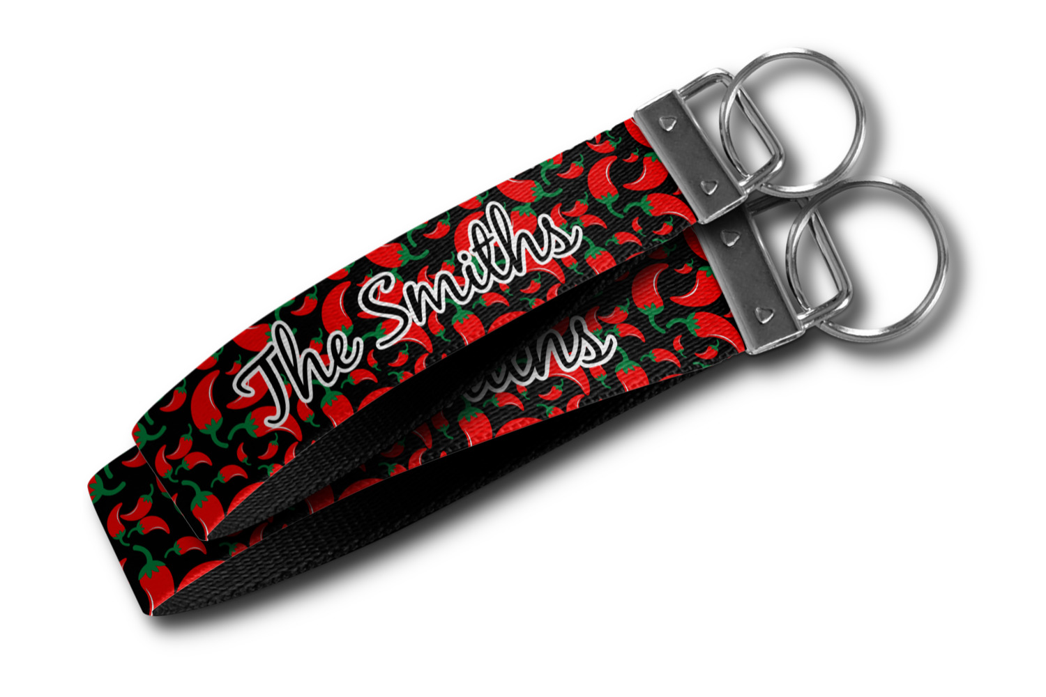 These key fob keychains are made from a polyester weave, right here in the USA. They feature a silver, metal clasp, attached to a round keyring. The piece gives the personalized wristlet a beautiful, finished look. Your customized design is printed on the outside of the keychain strap. We carry these wristlets in two sizes: small, which is 5 inches in width, and large, which is 5.5 inches in width.