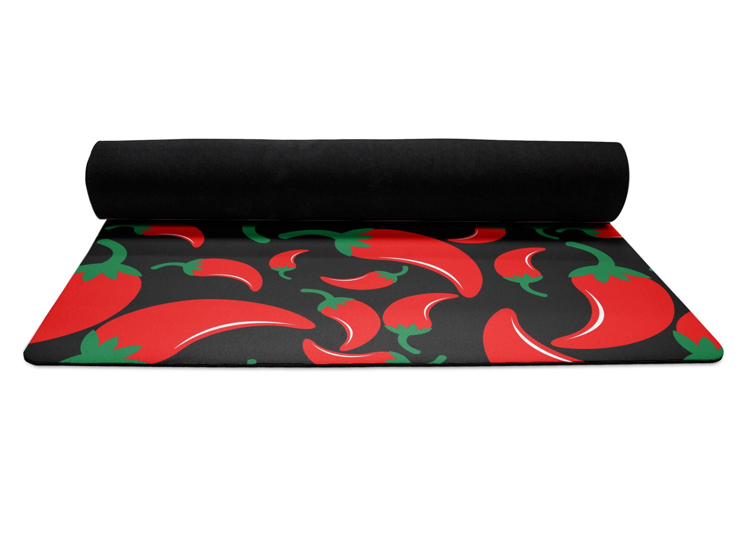 The chili peppers design is part of our fruits and vegetable collection. This design features red chili peppers in various sizes on a black background. The background can be changed to any color. I would recommend trying our white, gray, gold, teal or purple color as background choices.