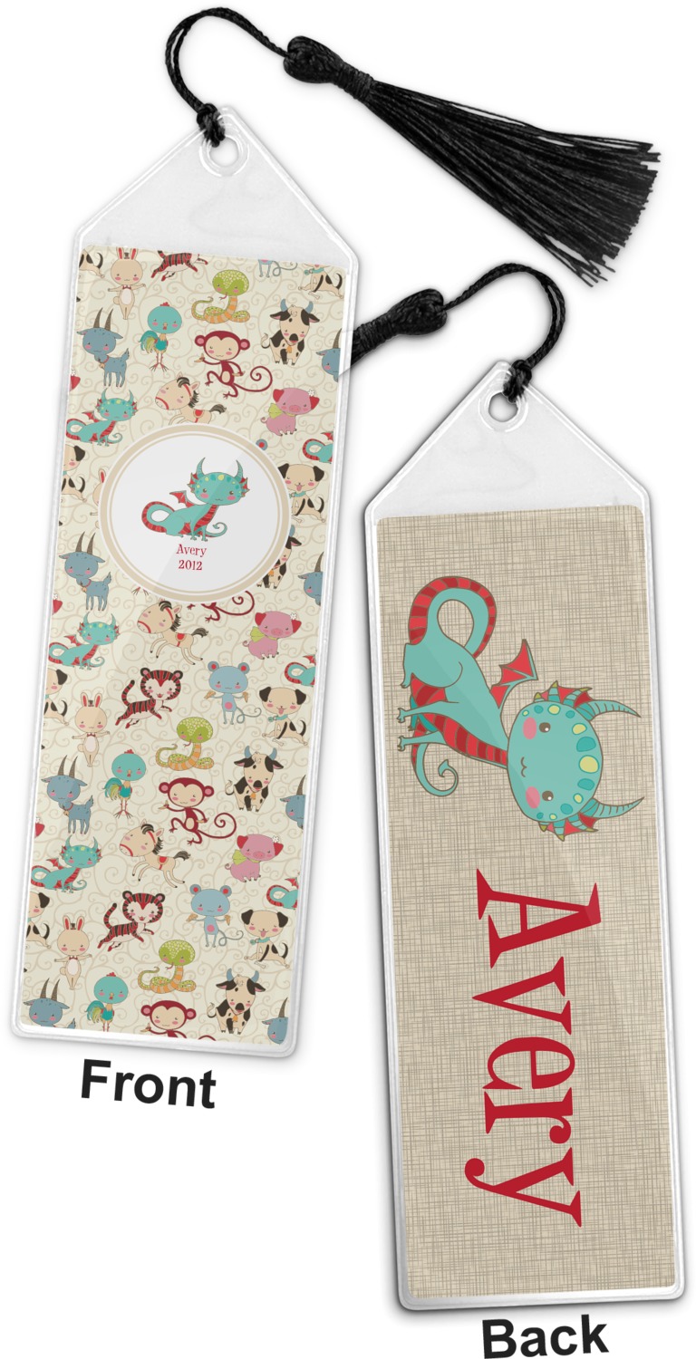 Your personalized bookmark is made of a sturdy, clear vinyl, and is approximately 7.5" x 2.25". We display your personalization on vinyl inserts that are placed on both sides. Accompanying each book marker is a black, fringe tassel that attaches to the reinforced, triangular header.