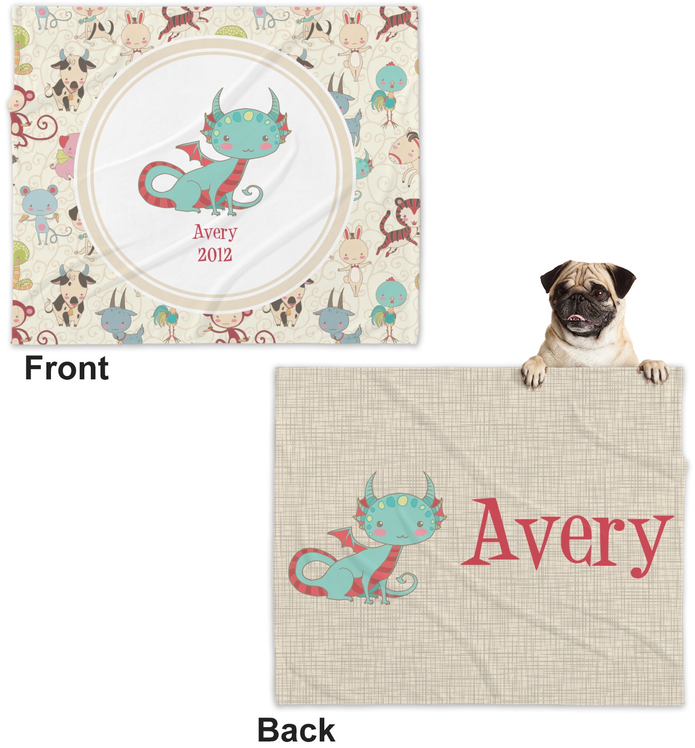 These dog blankets are crafted from a gentle, soft-to-the-touch, minky material. We print your customizations, either matching or differing, on both the top and underside of the blanket. These personalized dog blankets are available in two sizes: regular and large. Our regular size, at 40" x 30", accommodates small and some medium size dogs. At 60" x 50", our large dog blanket is a better fit for bigger breeds. Though specialized for dogs, these blankets still make a thoughtful gift for your favorite feline, or any other pet in mind!