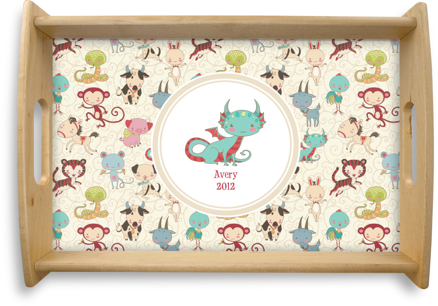 .We chose a round label with the child's name and year of birth for personalization in red and then paired it with the matching sign zodiac sign - which in this case is the dragon.
