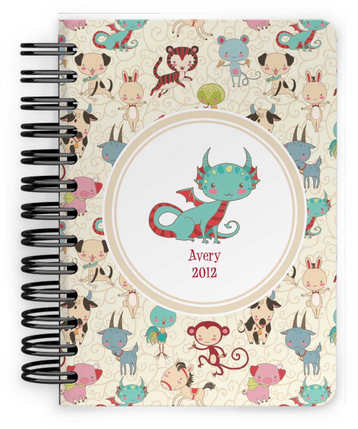 This spiral notebook includes 75 sheets of thick, ruled paper. The front and back of this custom notebook is made of a robust, laminate, plastic covering. We print your personalization on these two panels, underneath a glossy finish, which emphasizes the colors of your design. The two panels and the sheets of paper are held together by a sturdy, black coil. The paper within your bound notebook is perforated for easy, clean tearing.