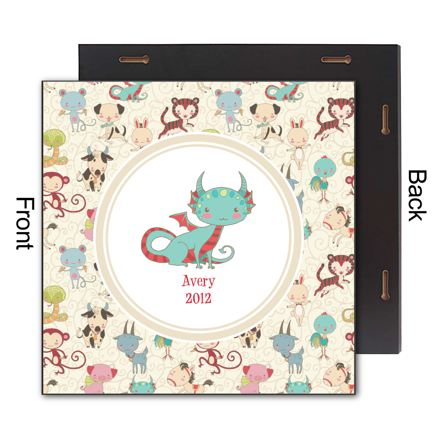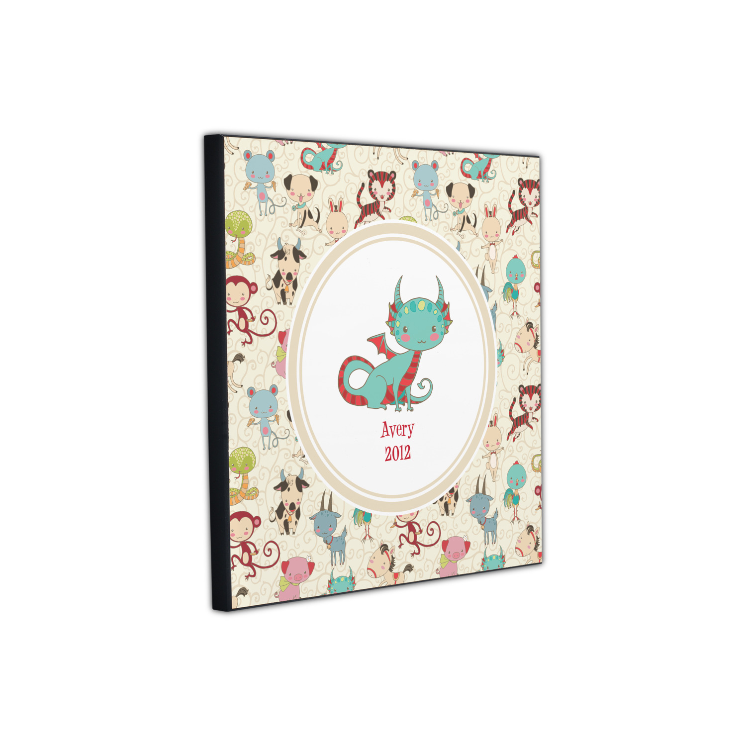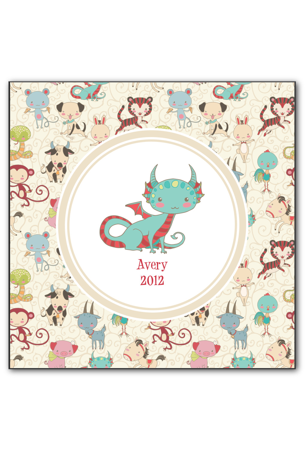 .We chose a round label with the child's name and year of birth for personalization in red and then paired it with the matching sign zodiac sign - which in this case is the dragon.
