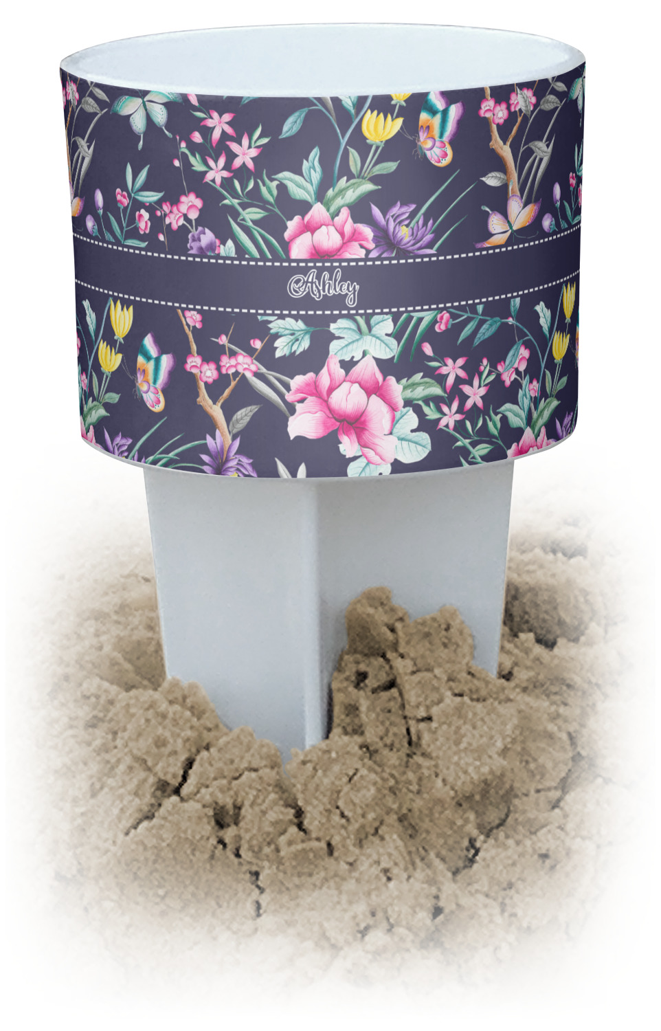 This cup holder has a large stake at its bottom that anchors it to the sand or ground below, while the cup holder rests above the stake. The entire drink holder is made of durable plastic and displays your customization around the cup holder portion. We sell these personalized beach spikers in two different colors: black and white.