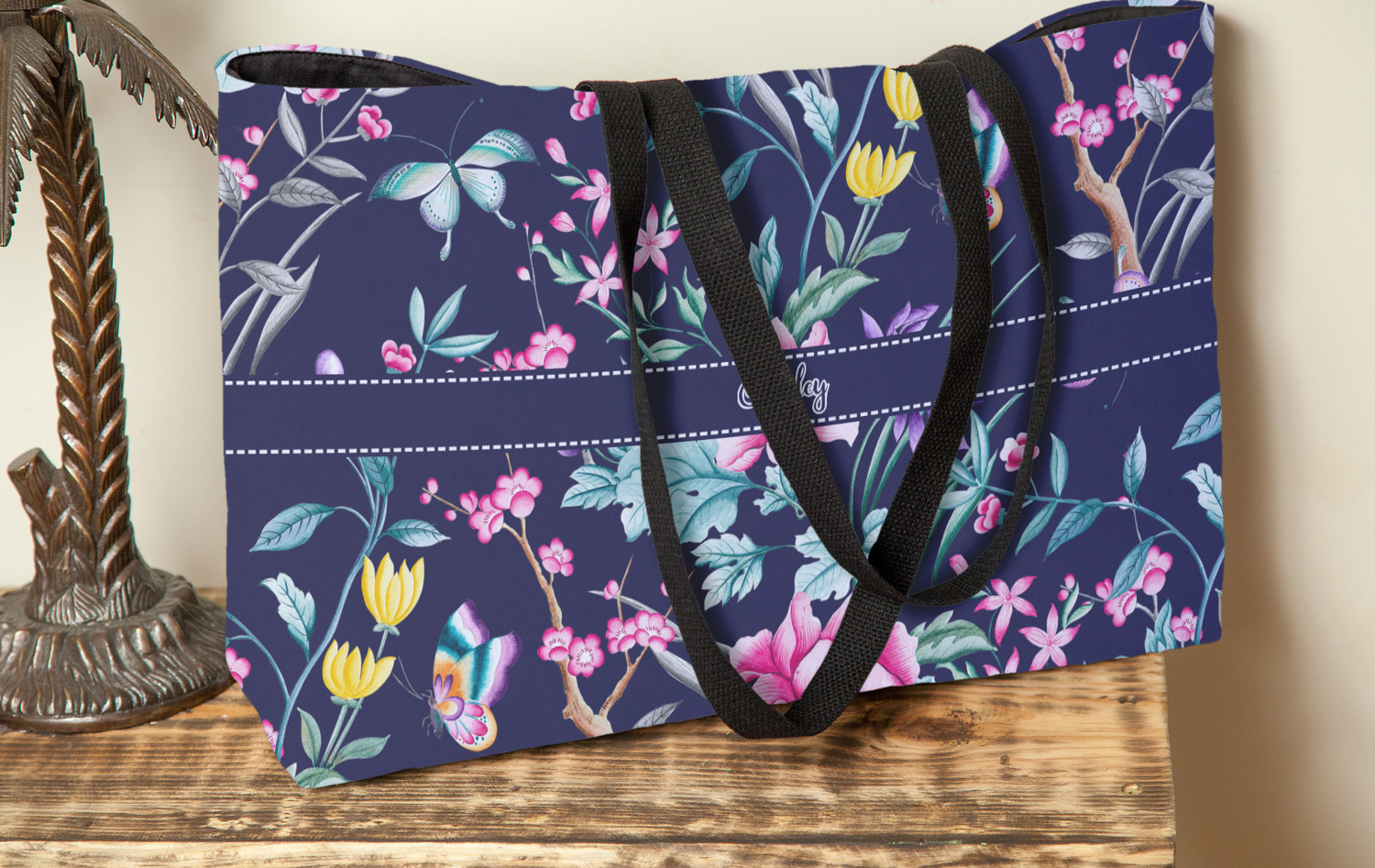 These beach totes are handmade here in the USA. Fabric is printed with your design. The tote is then sewn from the fabric pieces, lining and handles added.
