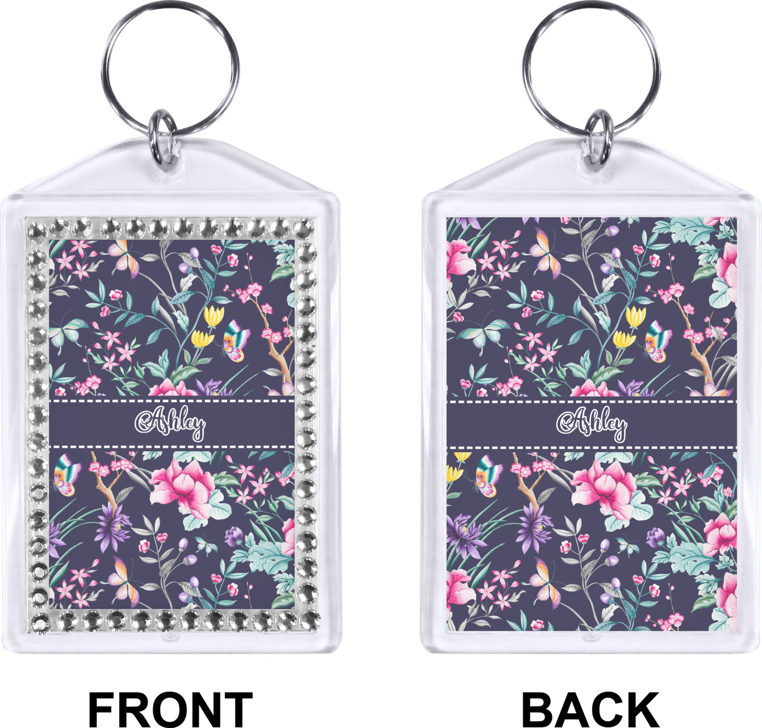 Our personalized keychains have a bold, rectangular shape, outlined by a series of shimmering rhinestones. A metal, split keyring is included with your purchase, and an additional metal hoop allows for attachment of the keychain to the split ring. This unique keychain measures at about 3.75 by 2.5 inches. We print your customized design(s) across both the back and front of this keychain.