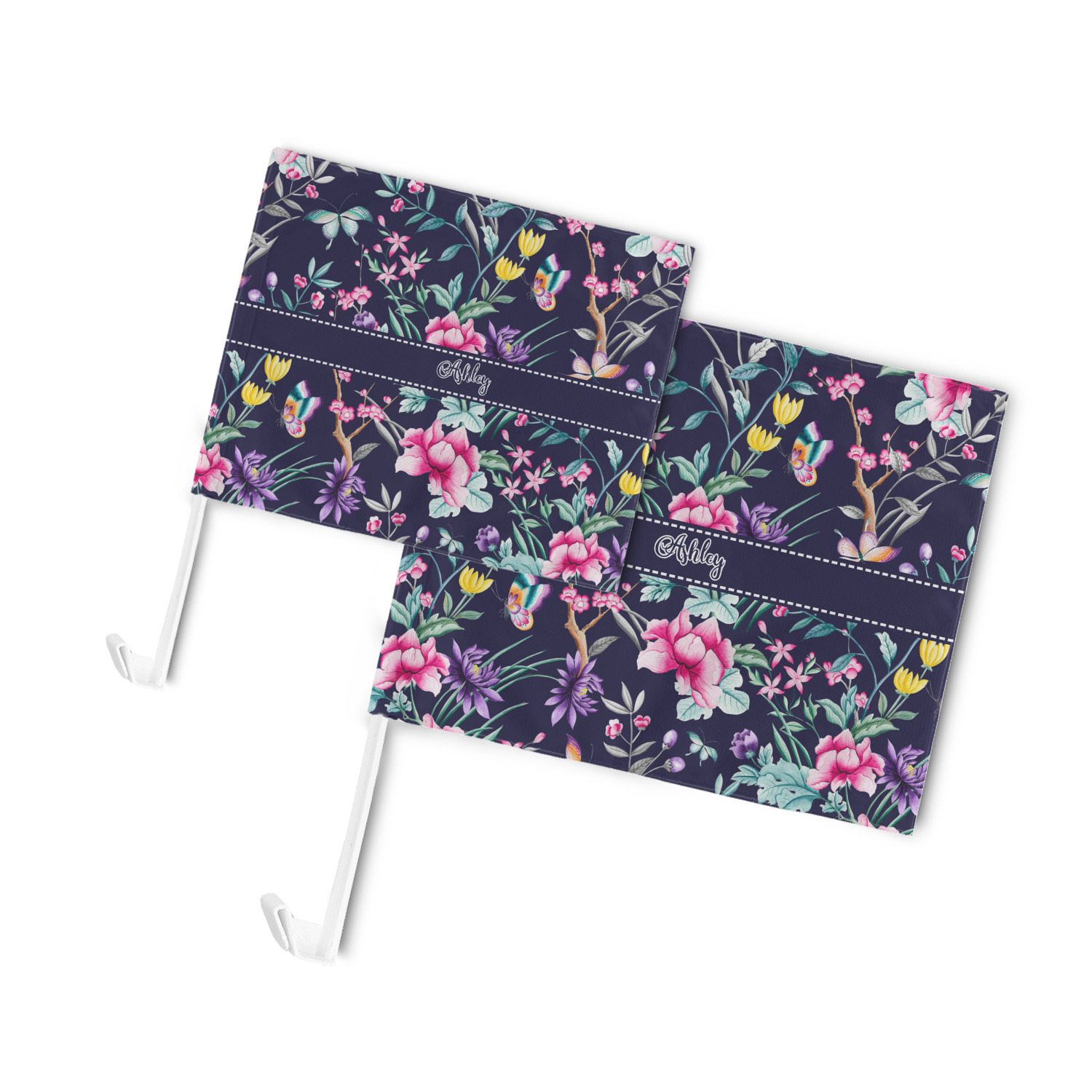 Our personalized flags are made from a durable, yet lightweight cloth that will proudly bear your logo or design of choice, while withstanding the outside elements. We have two size options - 8" x 11" and 11" x 15". Both come with a flag pole which includes a clip that secures the pole to the side window, whether it is rolled up or down. The flags are printed on both sides to display your design from all directions.