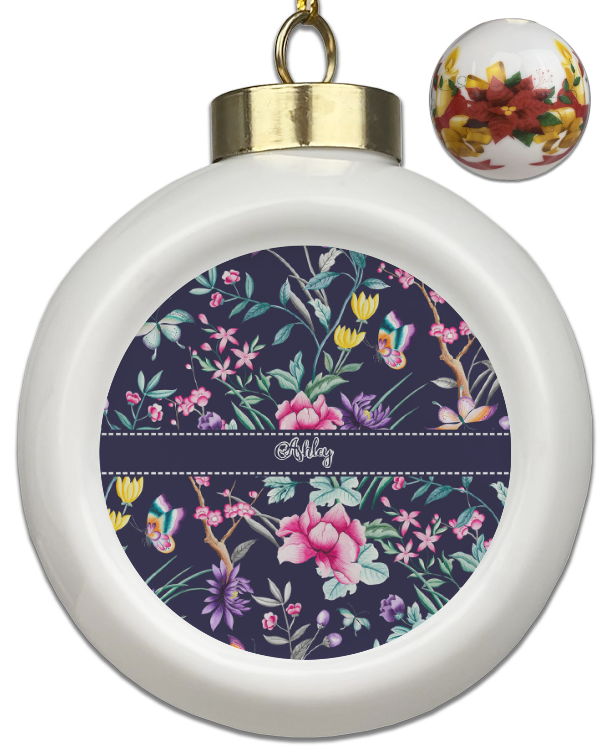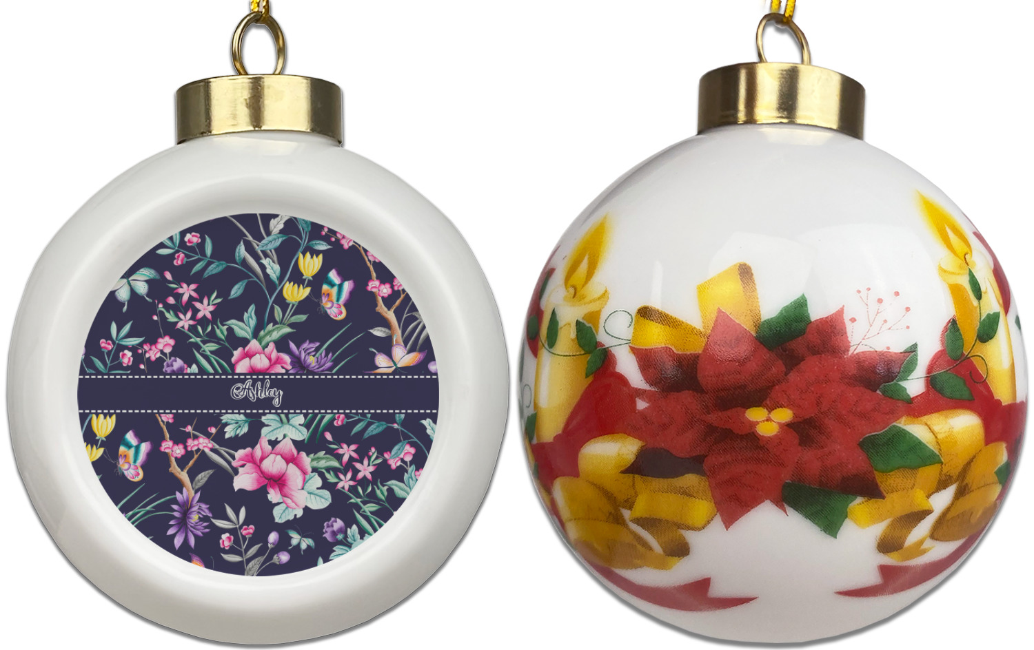Our Christmas ornaments are a unique ceramic ball shape with a twist as it has a flat face to display your custom design! Select from one of our two design types - Christmas Tree or Poinsettia Garland - to adorn the curved back of your personal design. Each ornament measures 3H x 2.5W x 2D accompanied with a gold string accent for finishing touches to hang on your beautiful Christmas tree!