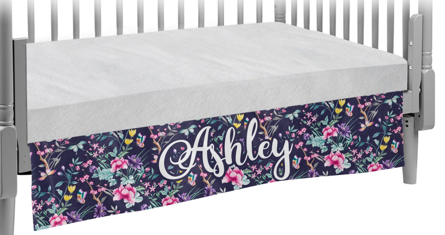 This baby crib skirt is made from two different materials and has split corners for easy placement and removal. The four corners are made from a soft, minky-like material, while the center is made of microfleece. The dual fabric makes this product durable, and still soft-to-the-touch. We provide you with the option of designing each of the four sides to be entirely unique, or to match one another, depending on your creative vision. Your personalization is displayed across the outside of the custom crib skirt, in vibrant colors. When inserted, each side panel drops 15" and is designed to touch the floor at its lowest setting.