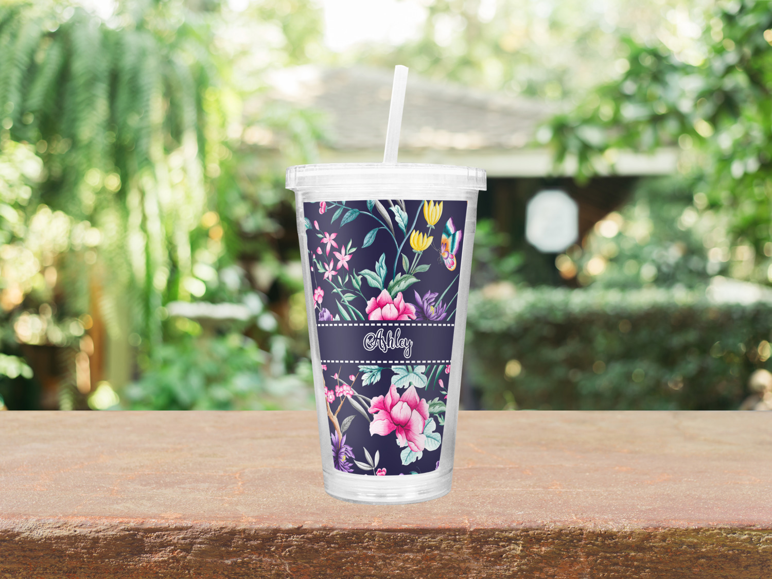 These BPA free tumblers with their double walls keep your drink cold and will not sweat on the outside; they have a clear acrylic top and a reusable straw with a ring around the bottom to keep the straw from falling out.