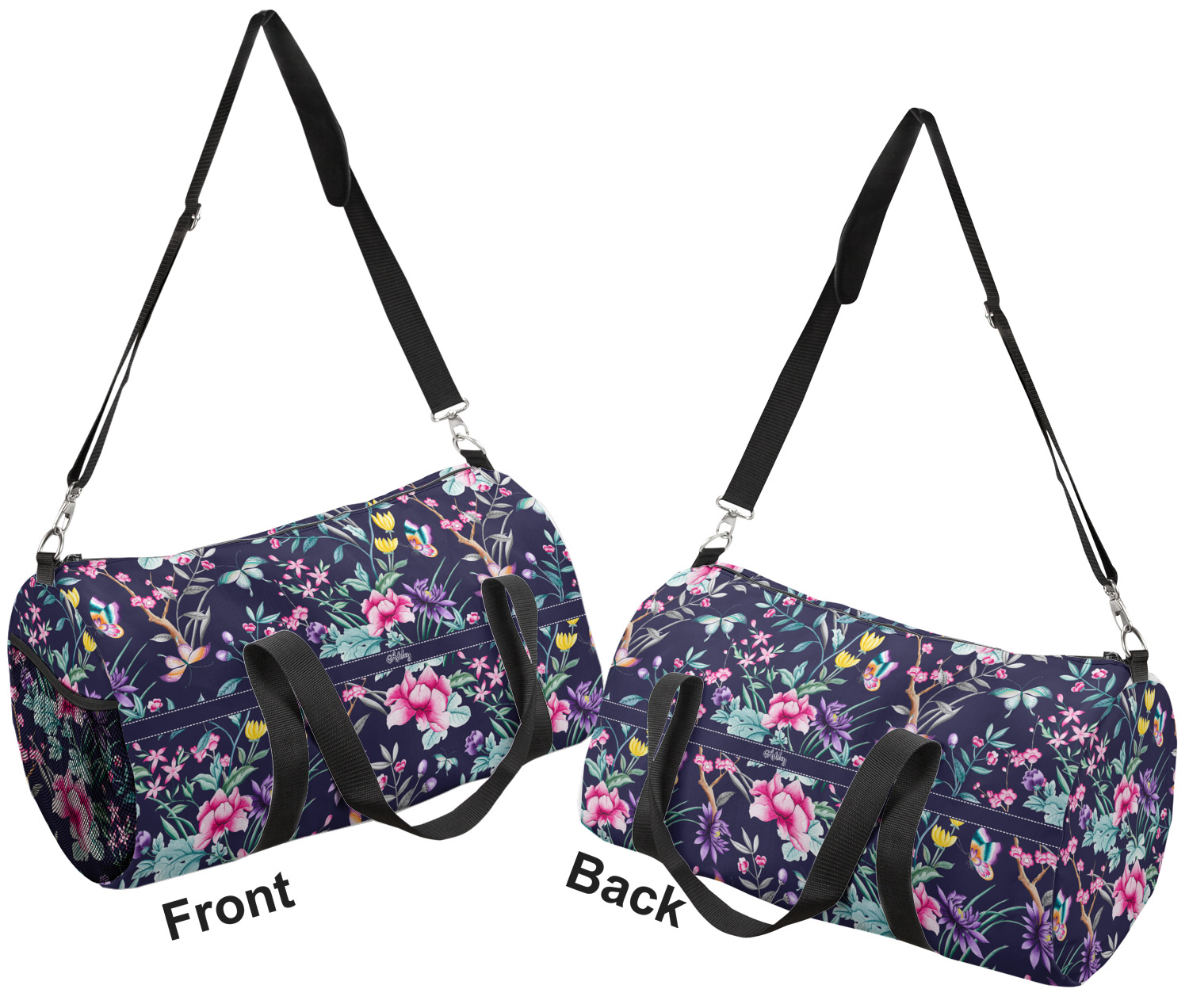 This duffle is a sturdy bag made of a canvas material. It comes in two sizes: Small (19"W x 9.5"H x 9.5"D) and Large (23"W x 12"H x 12"D). The bag is a cylindrical shape with a black adjustable strap and two handles. On one side is an elastic pouch to put a waterbottle or other small item. Your product will be sublimated with your design and is able to be designed on the front, back, and sides. Be sure to remember that the straps may cut into parts of your design if you upload your own artwork.