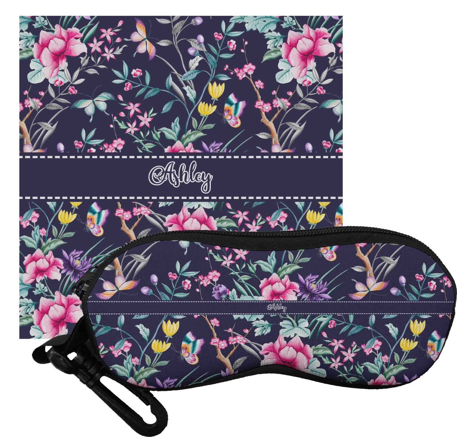 The cases have the design on both sides, a black zipper, and clips for hanging on a belt buckle or purse strap and also include matching lens cloths.