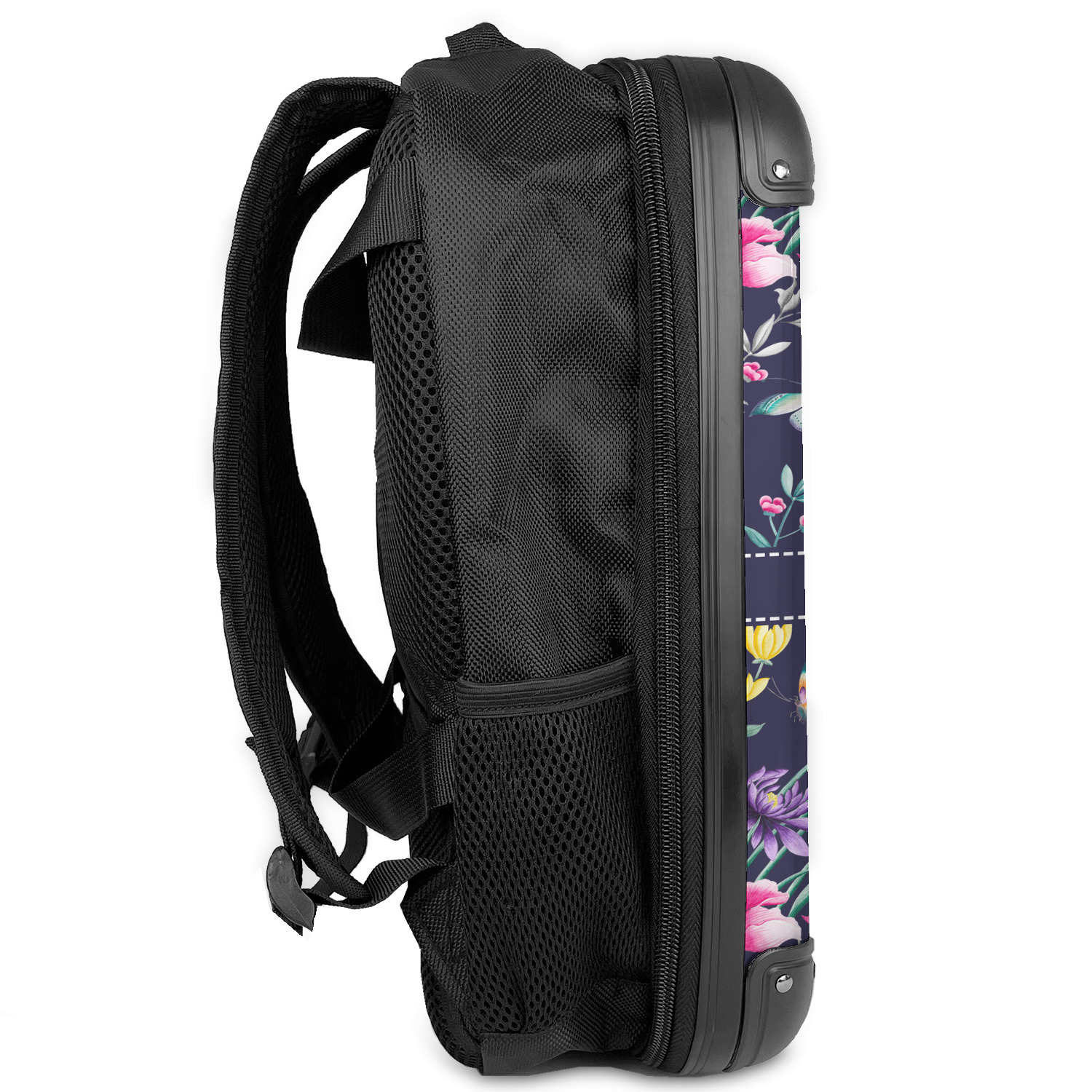 On the top of the backpack there is a handle for ease of carrying if needed. There are two velcro flaps to allow you to open the backpack fully flat if you desire. On the back are adjustable straps for wearing it on your back as well as two loop straps to slide it over a luggage handle for easy travel. The back is also lightly padded to ensure comfort for the wearer. There are two small mesh pockets on each side of the backpack.
