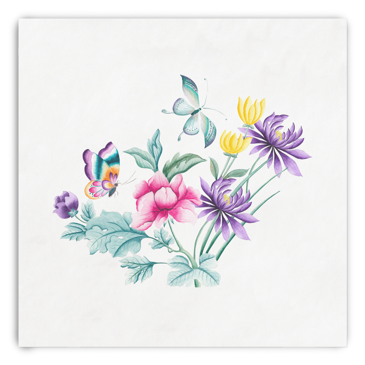 The beautiful chinoiserie design is done with a chinoiserie pattern that is hand painted watercolor flowers & butterflies. The pattern was inspired by motif and techniques of the far east and was popular during the 18th century.