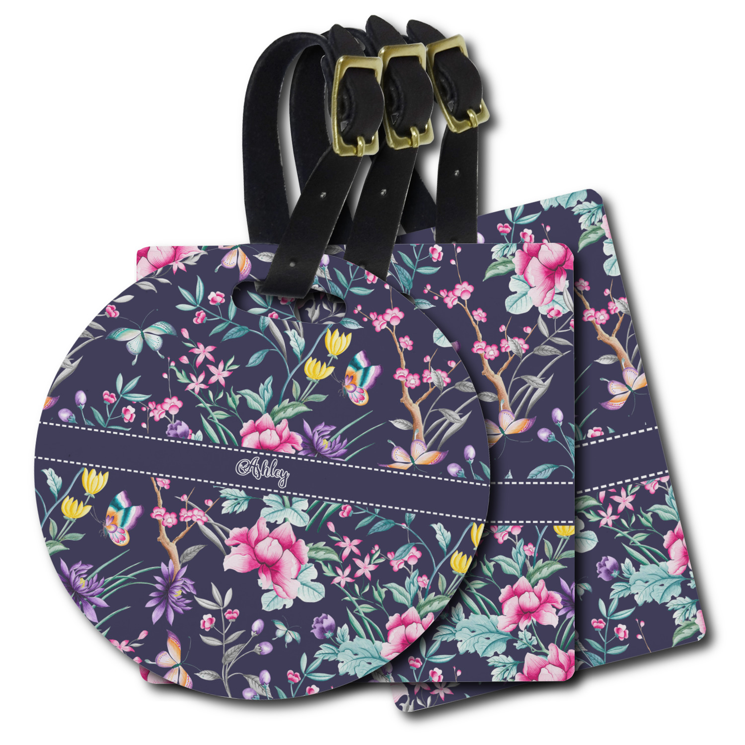 These personalized bag tags are sold in a variety of shapes, so that you may find the product that meets your vision exactly. We sell a round luggage tag, which measures at approximately 4" x 4". Our square luggage tag is about 3.5" x 3.5", while our rectangular version is 2.75" x 4 ".