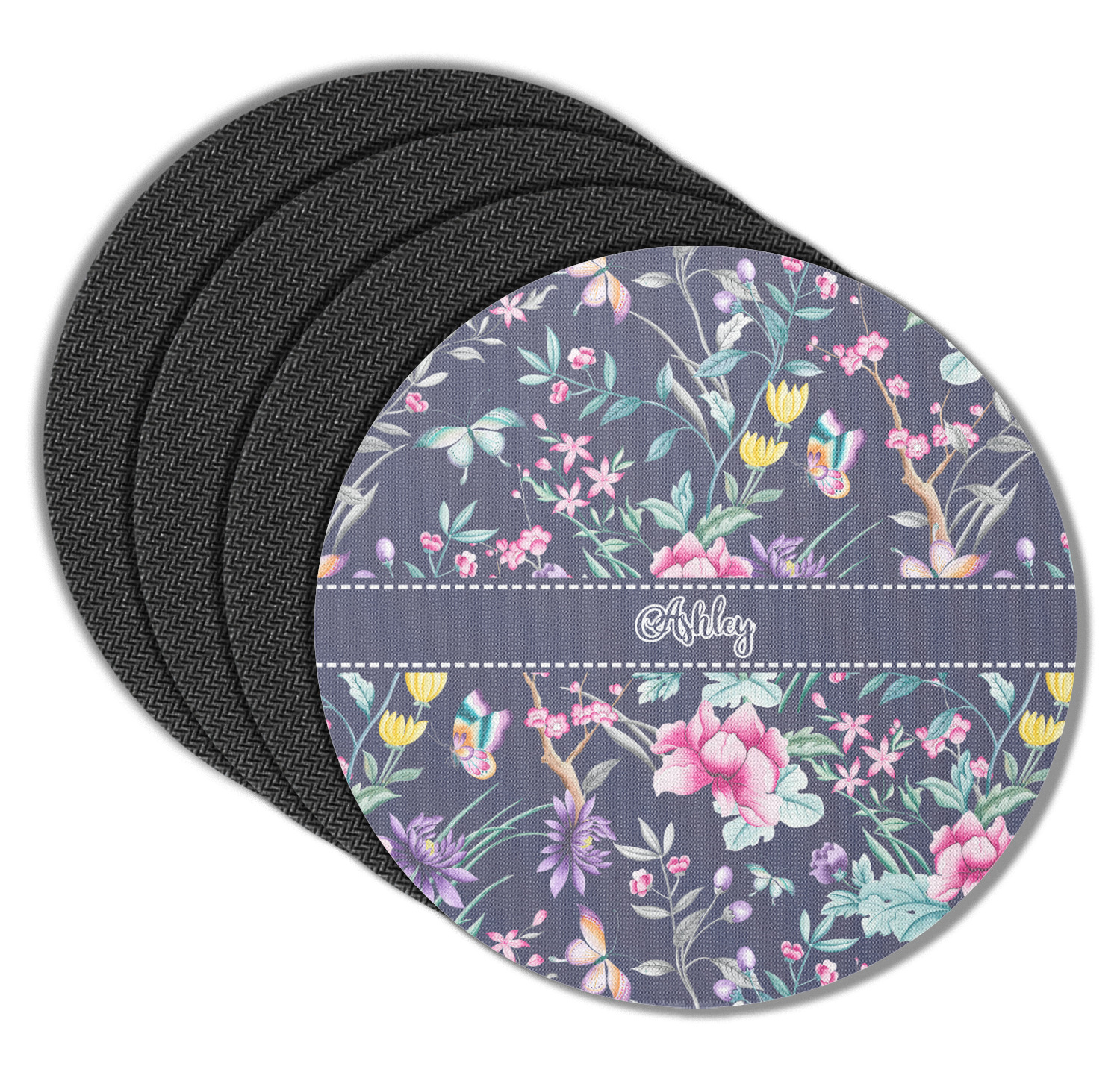 These drink coasters have a smooth, polyester top and a textured, rubber backing on its bottom. The non-slip rubber backing underneath works to keep any spills at bay. At 4 by 4 by 0.25 inches thick, these custom coasters are a suitable size for most drinkware. Your personalization is displayed atop the face of the cup coaster. We sell these rubber coasters in two different shapes: square and round. You can buy each shape as singulars or as a set of 4.