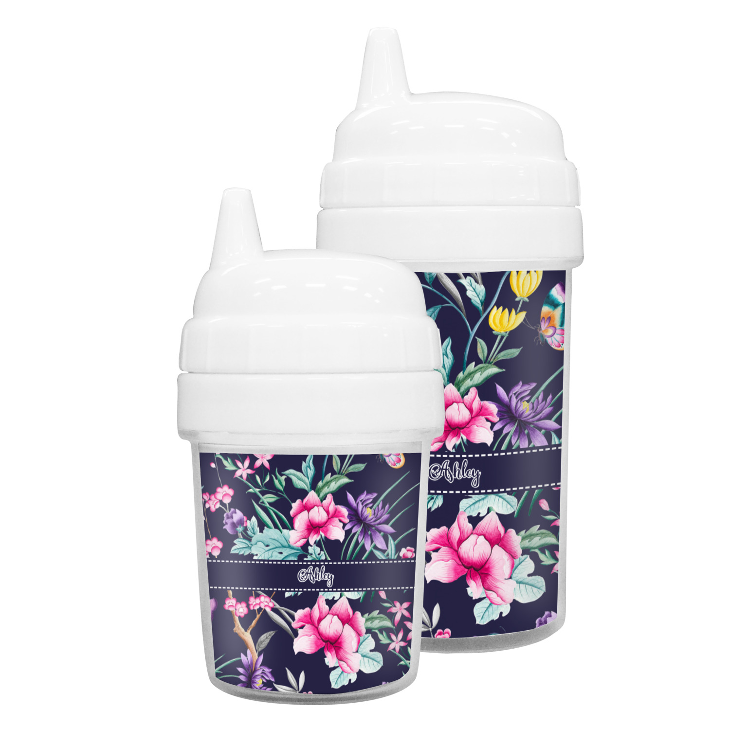 Our toddler cups are free of BPA, and have a twist-open lid so that you can easily fill and clean these cups for your young ones. Each cup also comes with a sippy nozzle to reduce spills. We offer these custom sippy cups in two different sizes; we have a baby sippy cup that holds 5 ounces, and a toddler sippy cup that holds 10 ounces. Your customization is printed on a premium glossy media insert that is placed within these toddler drinking cups.