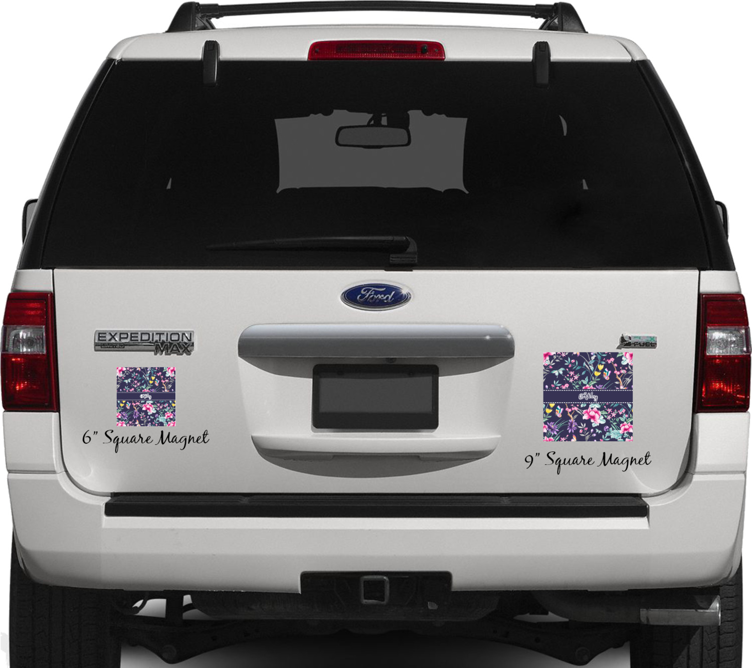 Your personalized car magnets are available for purchase in two shapes and two sizes. We carry round and square editions; each shape can either be 6 by 6 inches, or 10 by 10 inches, depending on your needs. Both versions are 1 millimeter thick, which is considered, within the industry, as the ideal thickness for automobile magnets. The magnetic car decals will adhere to any smooth, metal surface of your cars body, such as the trunk door or a side panel. However, please note that some vehicles are constructed from fiberglass bodies, which prevents the adhesion of anything magnetic. We advise that you test your vehicle before purchasing these magnets.