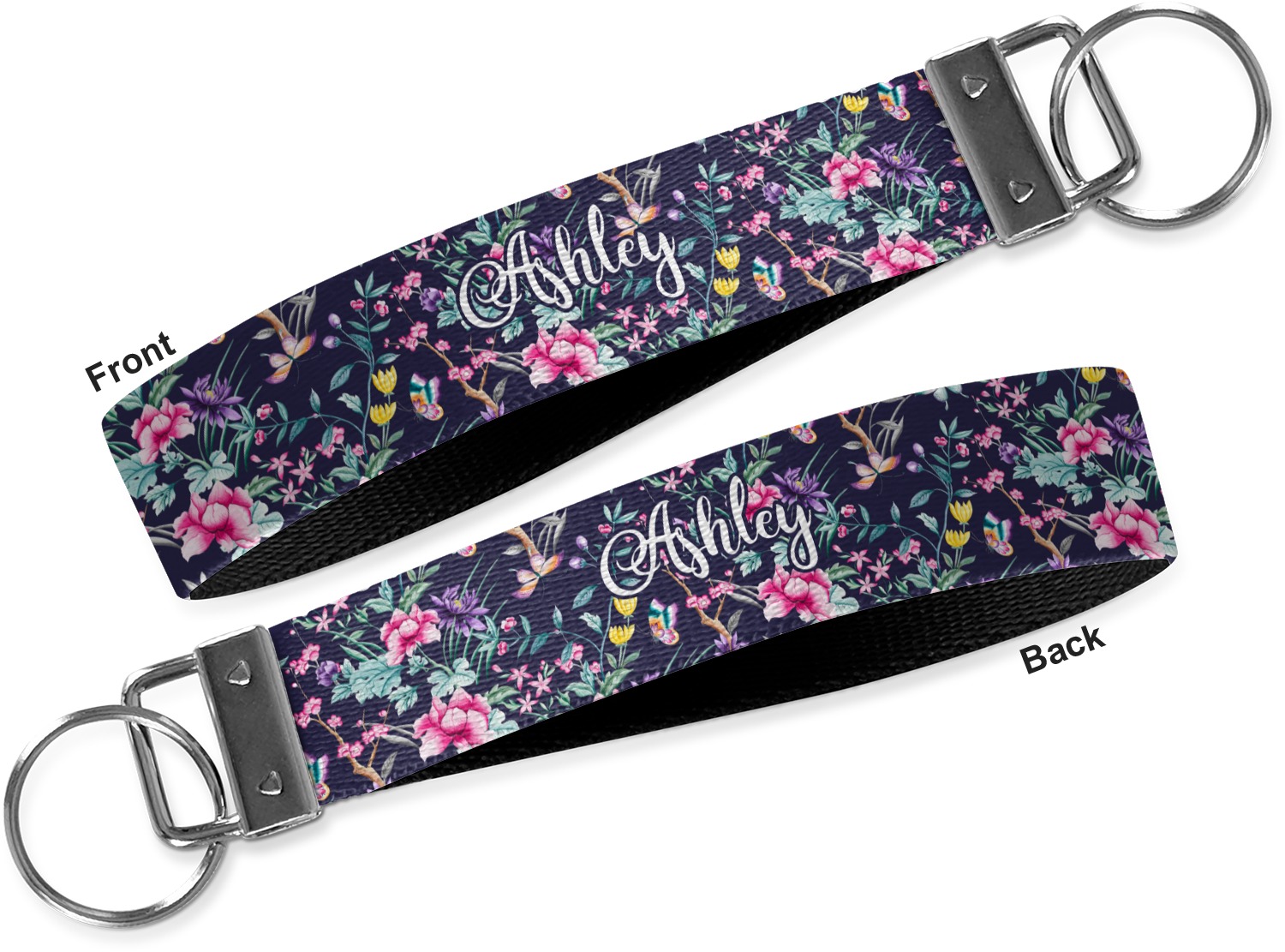 These key fob keychains are made from a polyester weave, right here in the USA. They feature a silver, metal clasp, attached to a round keyring. The piece gives the personalized wristlet a beautiful, finished look. Your customized design is printed on the outside of the keychain strap. We carry these wristlets in two sizes: small, which is 5 inches in width, and large, which is 5.5 inches in width.