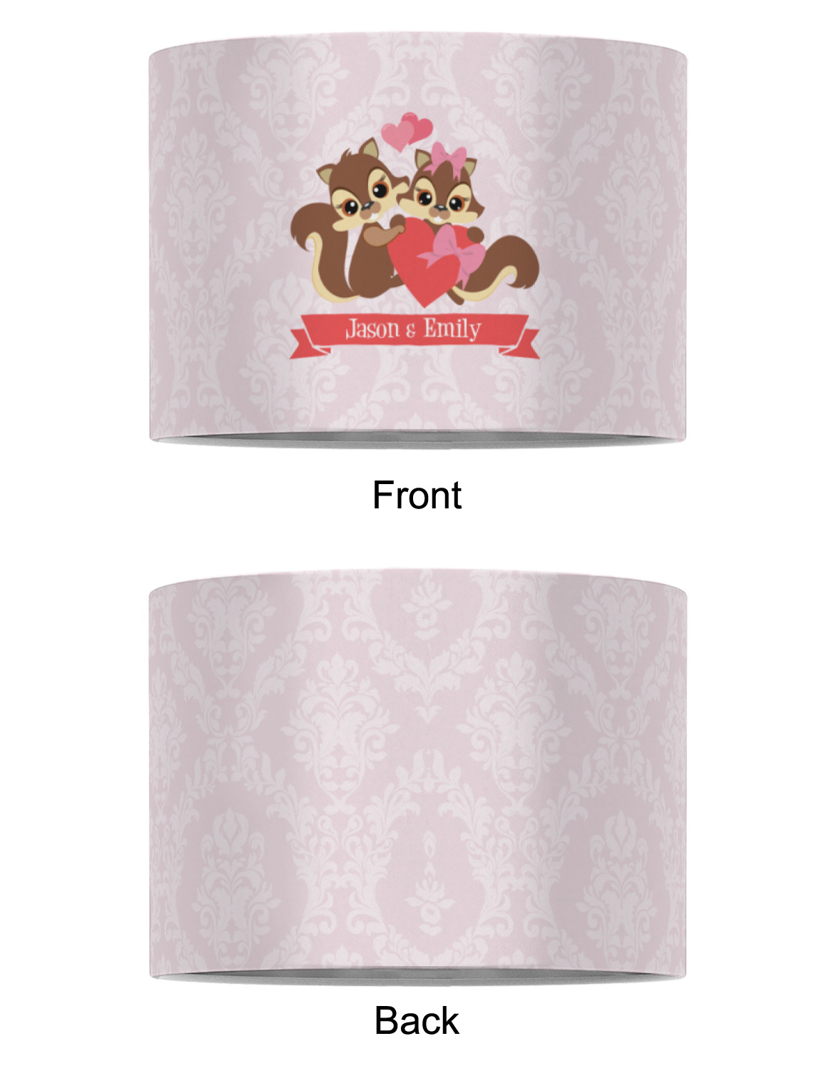 This Raccoon Couple Design is perfect for Valentine's Day or even for a newly engaged or married couple. It features a damask background in light pink with a raccoon couple in front holding hearts. The female has a bow on her head. There is a ribbon under the couple that can be customized with the couples names or even Mr. & Mrs. Your Text.
