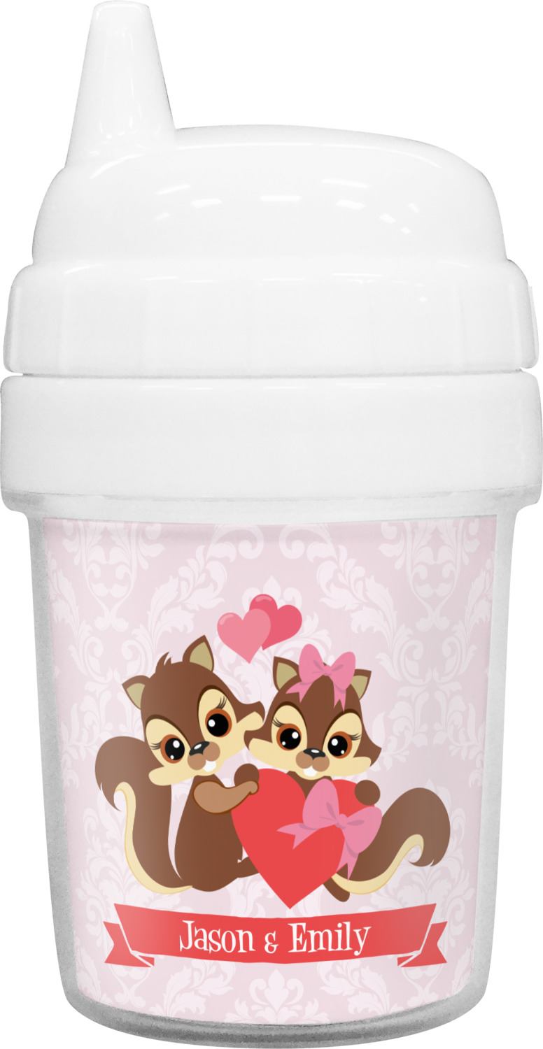 Our toddler cups are free of BPA, and have a twist-open lid so that you can easily fill and clean these cups for your young ones. Each cup also comes with a sippy nozzle to reduce spills. We offer these custom sippy cups in two different sizes; we have a baby sippy cup that holds 5 ounces, and a toddler sippy cup that holds 10 ounces. Your customization is printed on a premium glossy media insert that is placed within these toddler drinking cups.
