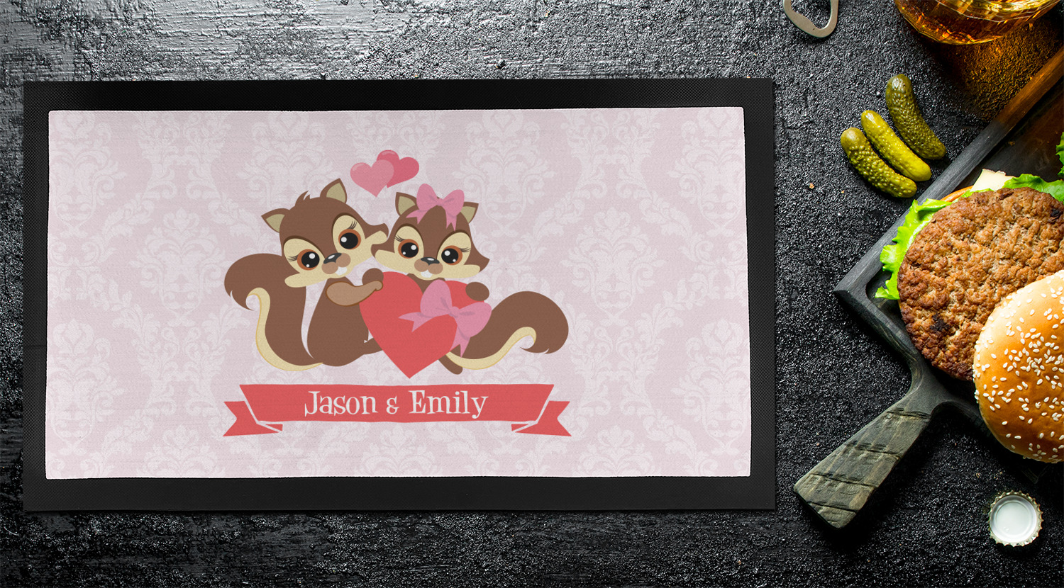 This Raccoon Couple Design is perfect for Valentine's Day or even for a newly engaged or married couple. It features a damask background in light pink with a raccoon couple in front holding hearts. The female has a bow on her head. There is a ribbon under the couple that can be customized with the couples names or even Mr. & Mrs. Your Text.
