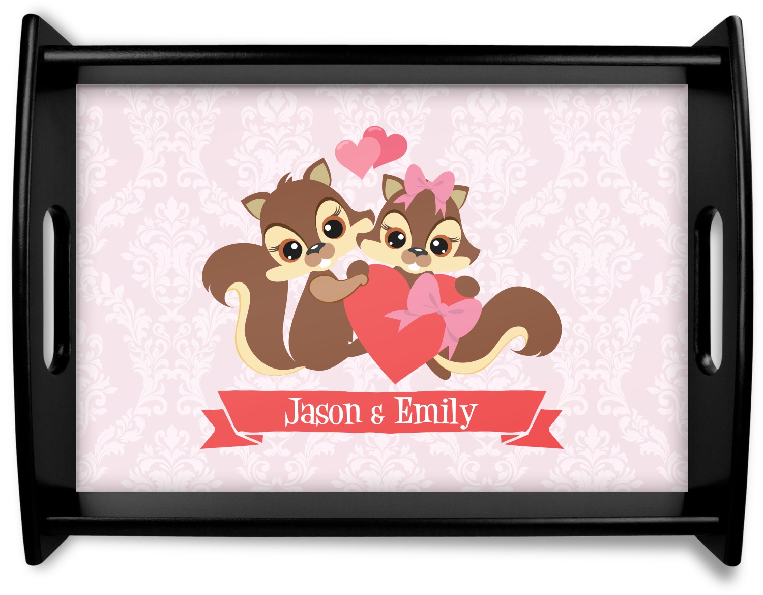 This serving tray with handles features square edges and two rounded sides, creating a very modern look. Each side is fabricated from a beautifully cut, natural wood. The bottom of the interior of the tray displays your customized design in bright, vibrant color. The tray is sold in both a black color and a natural wood look. Each variation of the wood serving tray has two sizes: Small, which is 14" x 10" x 2.25", and Large, which is 19.5" x 13.5" x 2.75".