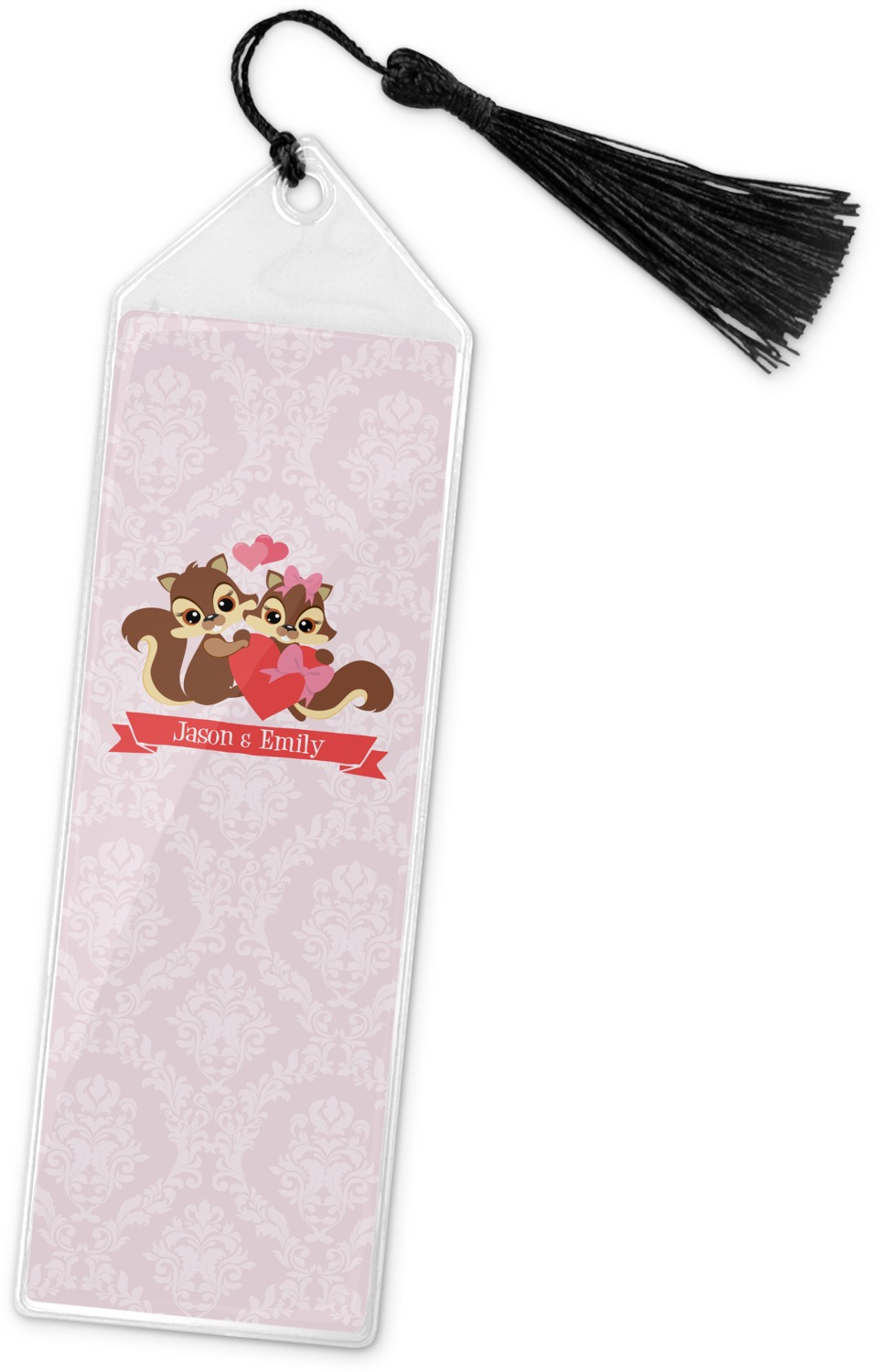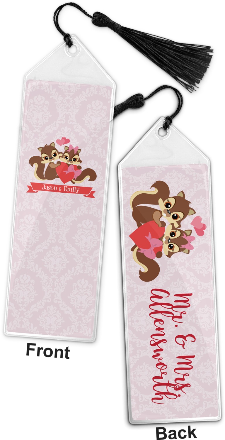Your personalized bookmark is made of a sturdy, clear vinyl, and is approximately 7.5" x 2.25". We display your personalization on vinyl inserts that are placed on both sides. Accompanying each book marker is a black, fringe tassel that attaches to the reinforced, triangular header.