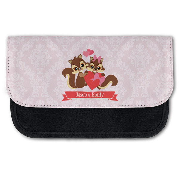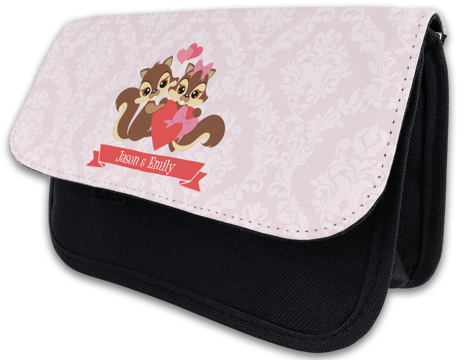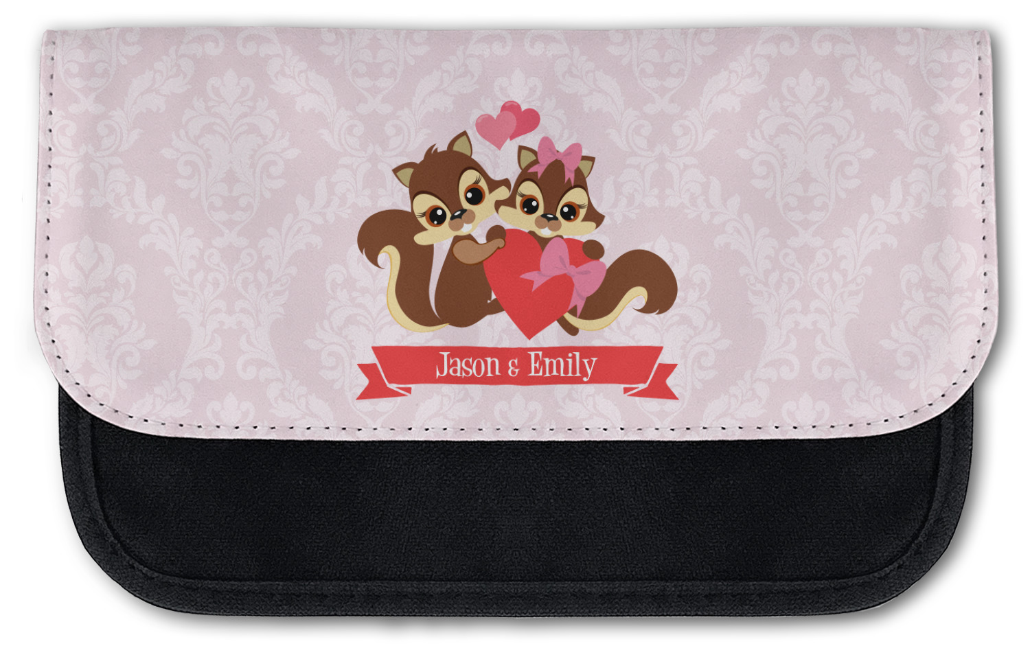 This Raccoon Couple Design is perfect for Valentine's Day or even for a newly engaged or married couple. It features a damask background in light pink with a raccoon couple in front holding hearts. The female has a bow on her head. There is a ribbon under the couple that can be customized with the couples names or even Mr. & Mrs. Your Text.
