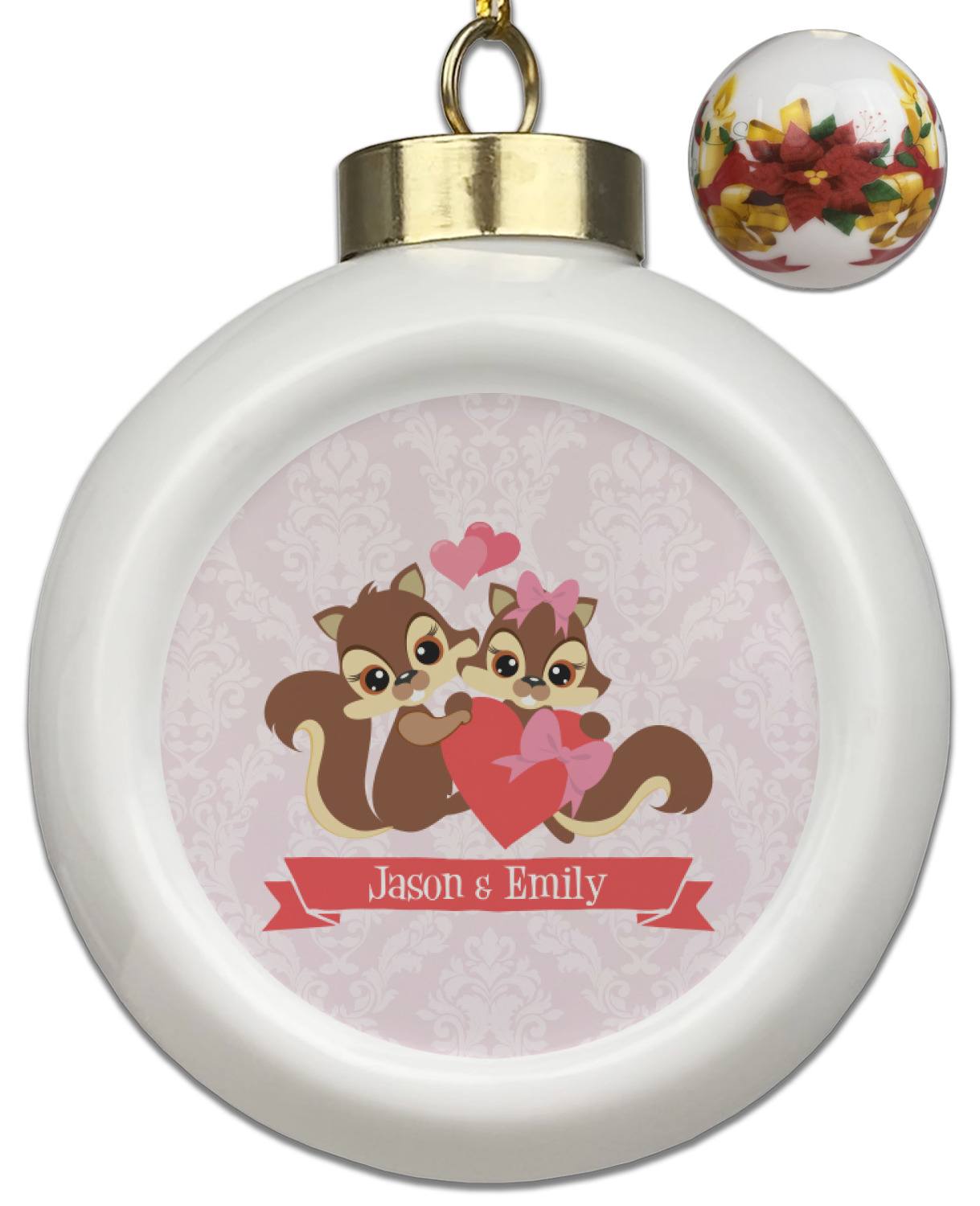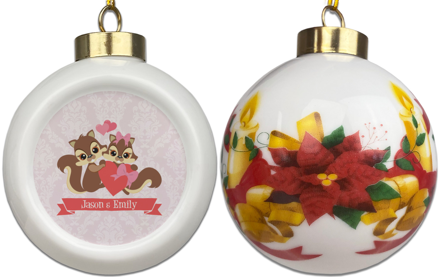 Our Christmas ornaments are a unique ceramic ball shape with a twist as it has a flat face to display your custom design! Select from one of our two design types - Christmas Tree or Poinsettia Garland - to adorn the curved back of your personal design. Each ornament measures 3H x 2.5W x 2D accompanied with a gold string accent for finishing touches to hang on your beautiful Christmas tree!
