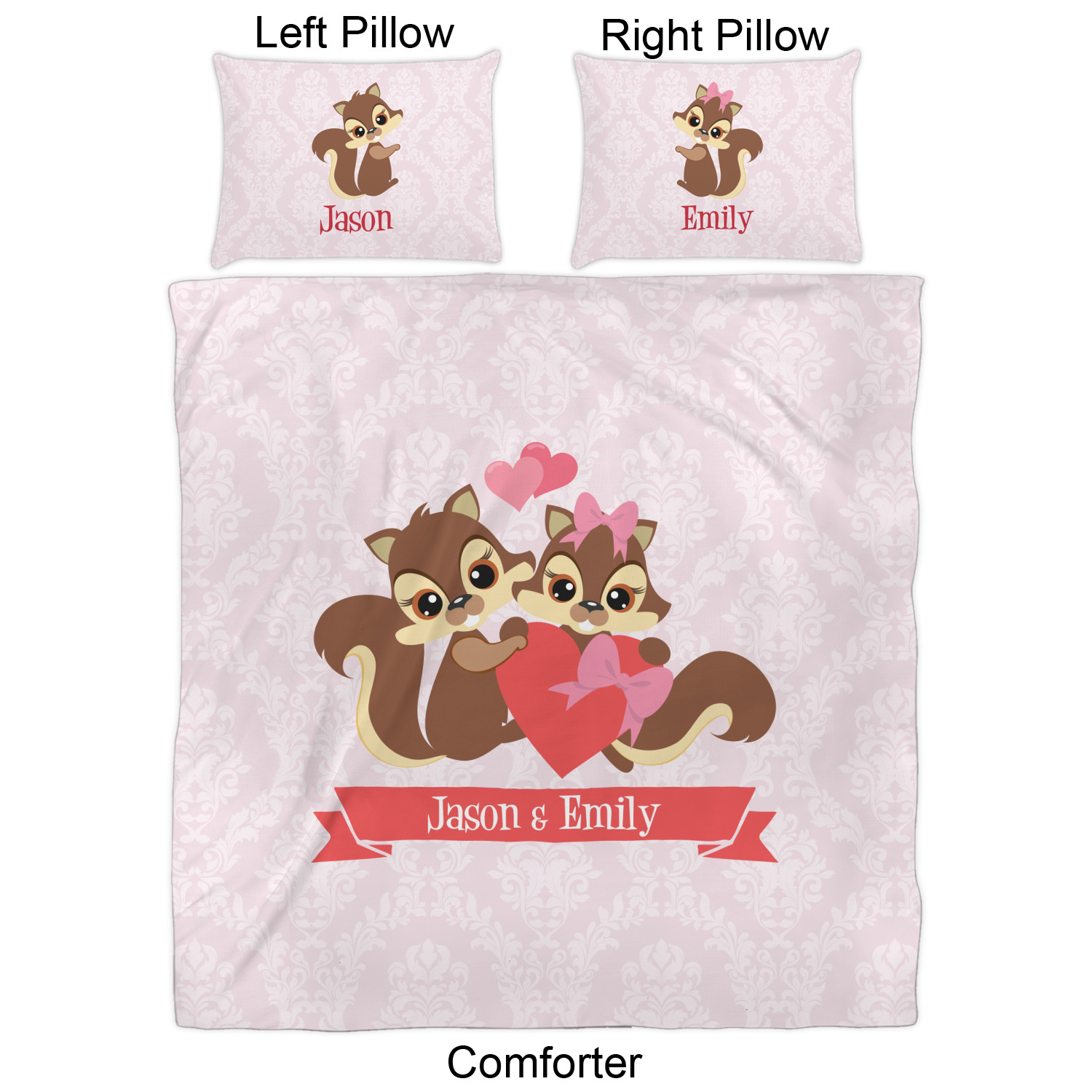 We have hundreds of different design templates for you to choose from Each design can be customized to your exact specifications. Not only can you customize the comforter, but you can also customize each pillow sham e.g. for a queen comforter set you have have Mr & Mrs pillow shams with the last name on comforter.