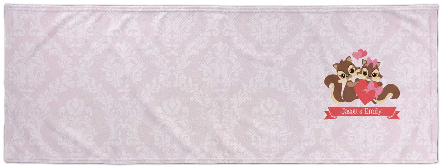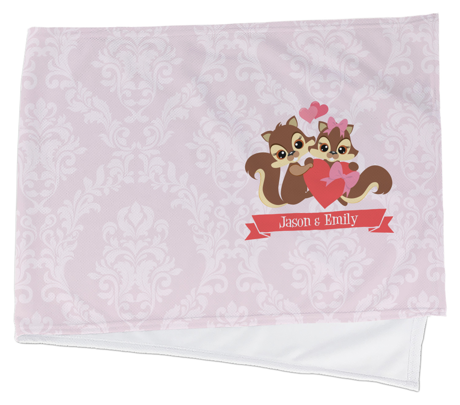 This Raccoon Couple Design is perfect for Valentine's Day or even for a newly engaged or married couple. It features a damask background in light pink with a raccoon couple in front holding hearts. The female has a bow on her head. There is a ribbon under the couple that can be customized with the couples names or even Mr. & Mrs. Your Text.