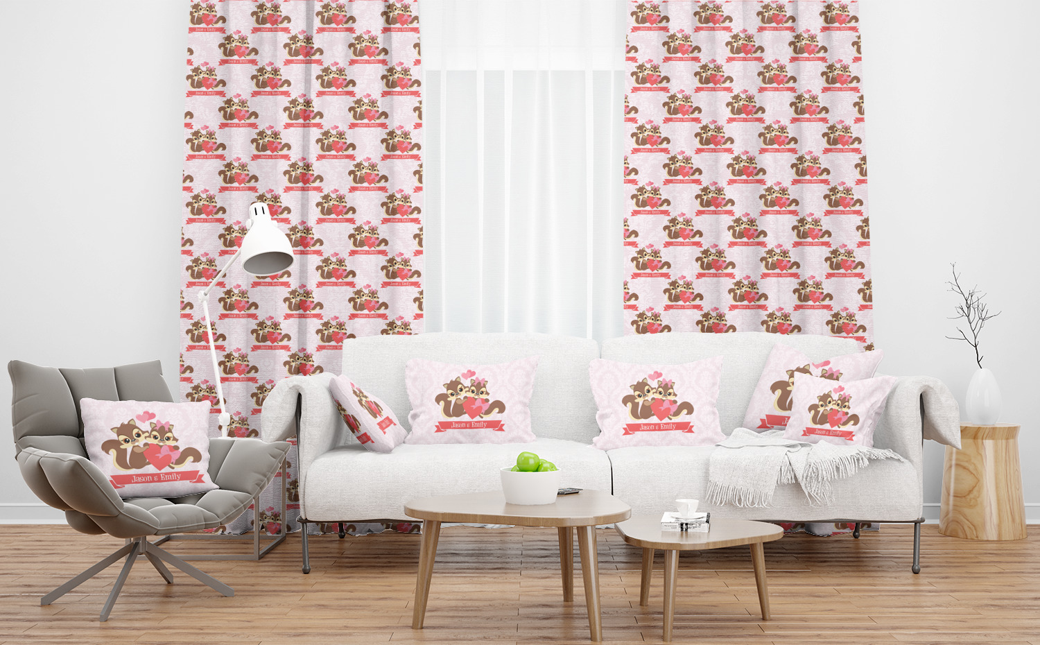 This Raccoon Couple Design is perfect for Valentine's Day or even for a newly engaged or married couple. It features a damask background in light pink with a raccoon couple in front holding hearts. The female has a bow on her head. There is a ribbon under the couple that can be customized with the couples names or even Mr. & Mrs. Your Text.