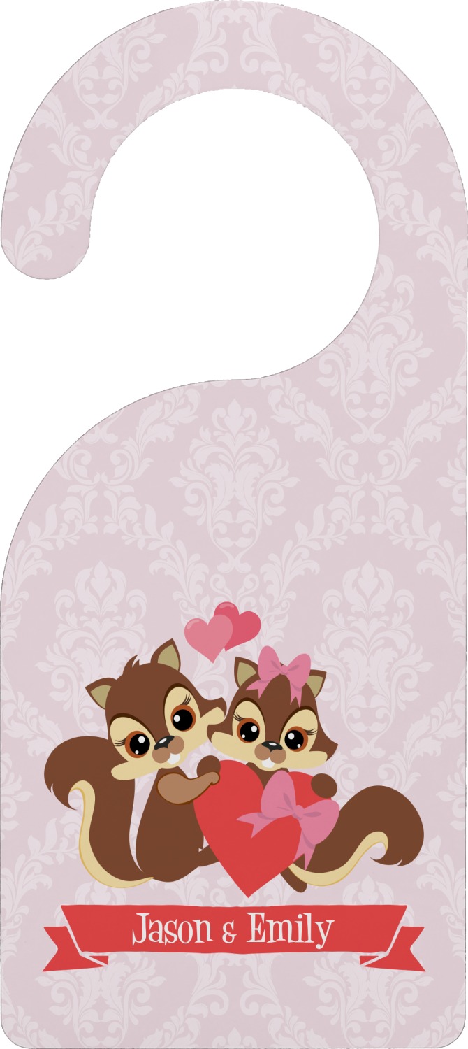 This Raccoon Couple Design is perfect for Valentine's Day or even for a newly engaged or married couple. It features a damask background in light pink with a raccoon couple in front holding hearts. The female has a bow on her head. There is a ribbon under the couple that can be customized with the couples names or even Mr. & Mrs. Your Text.