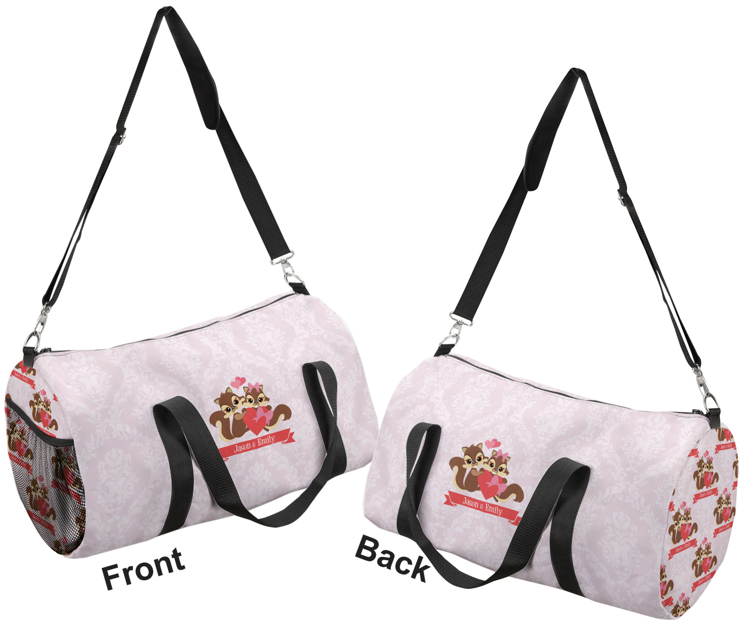 This duffle is a sturdy bag made of a canvas material. It comes in two sizes: Small (19"W x 9.5"H x 9.5"D) and Large (23"W x 12"H x 12"D). The bag is a cylindrical shape with a black adjustable strap and two handles. On one side is an elastic pouch to put a waterbottle or other small item. Your product will be sublimated with your design and is able to be designed on the front, back, and sides. Be sure to remember that the straps may cut into parts of your design if you upload your own artwork.