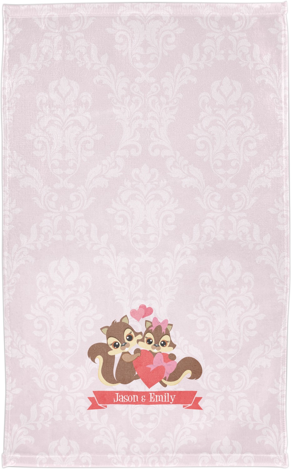 This Raccoon Couple Design is perfect for Valentine's Day or even for a newly engaged or married couple. It features a damask background in light pink with a raccoon couple in front holding hearts. The female has a bow on her head. There is a ribbon under the couple that can be customized with the couples names or even Mr. & Mrs. Your Text.