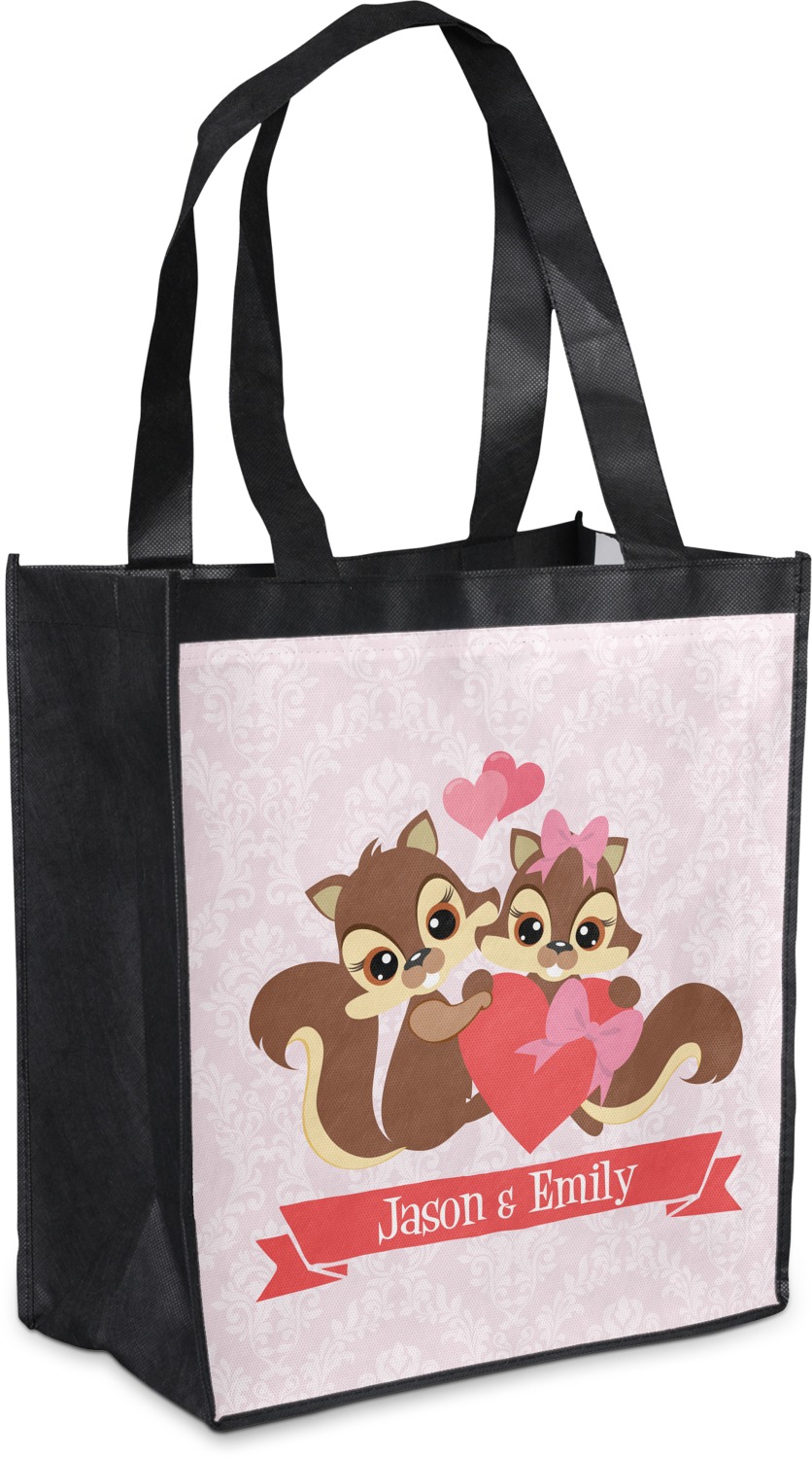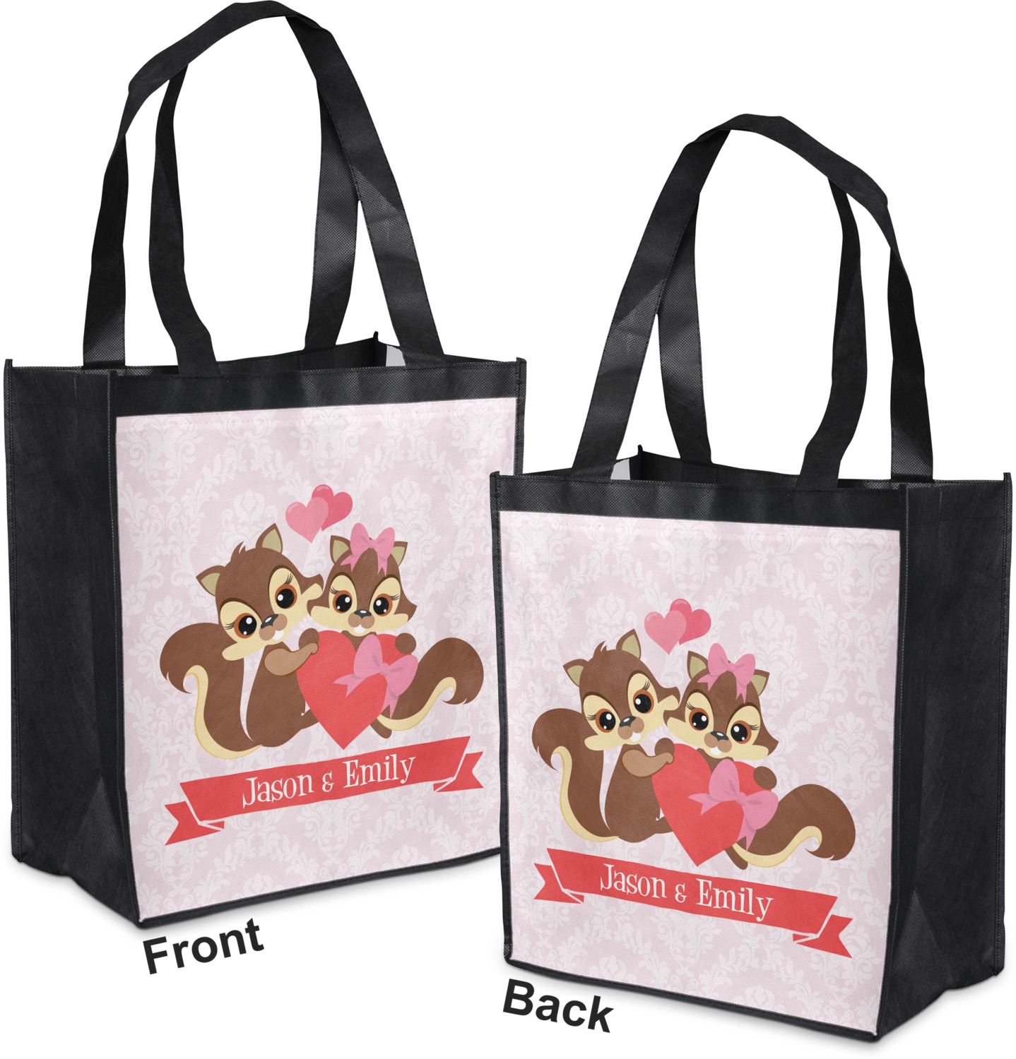 Made from a durable, biodegradable material, these reusable shopping bags can support up to 30 pounds of weight. With two large handles, measuring at 8.5 inches each, these personalized tote bags are easy to carry to your vehicle or home. The bag itself is 12 by 13.5 inches, and can expand to a depth of 7 inches. Your customization is printed on both the front and back, while the remaining sides, trim, and handle are a sleek, charcoal black.