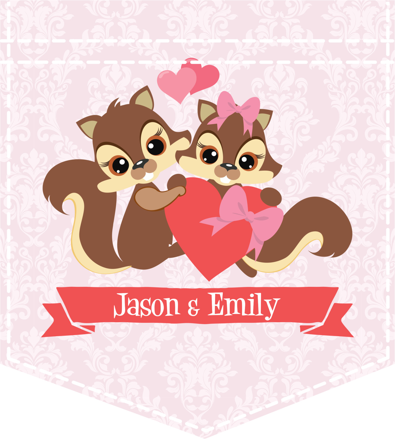 This Raccoon Couple Design is perfect for Valentine's Day or even for a newly engaged or married couple. It features a damask background in light pink with a raccoon couple in front holding hearts. The female has a bow on her head. There is a ribbon under the couple that can be customized with the couples names or even Mr. & Mrs. Your Text.