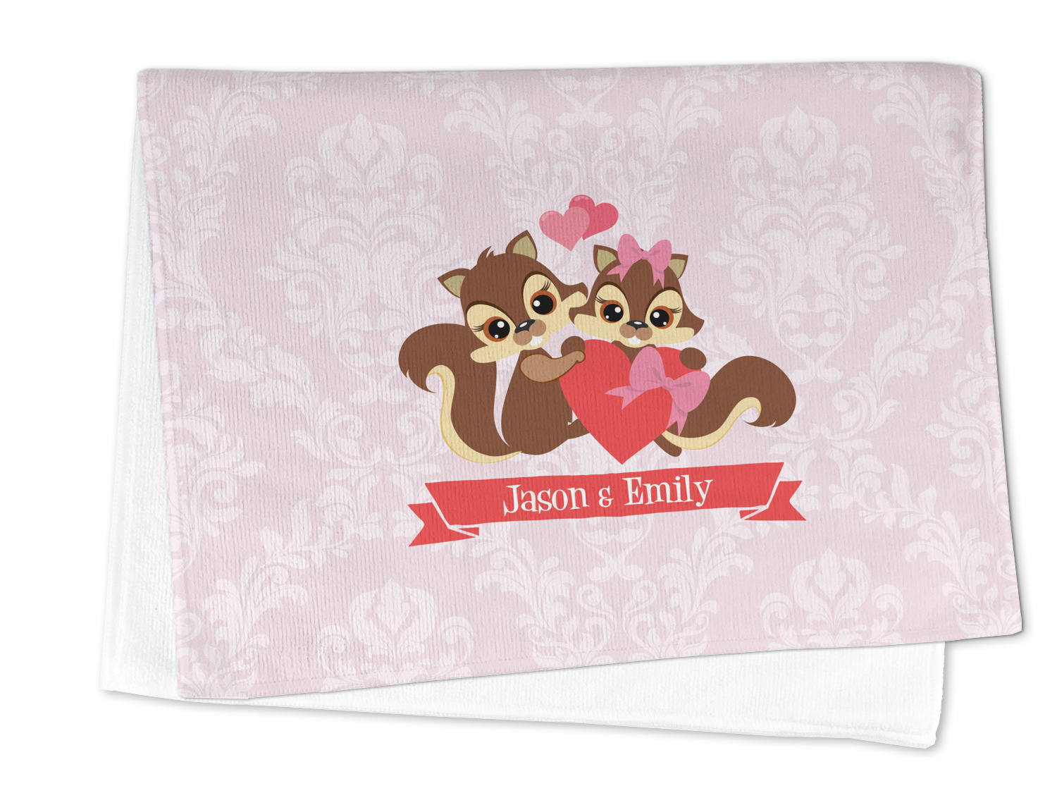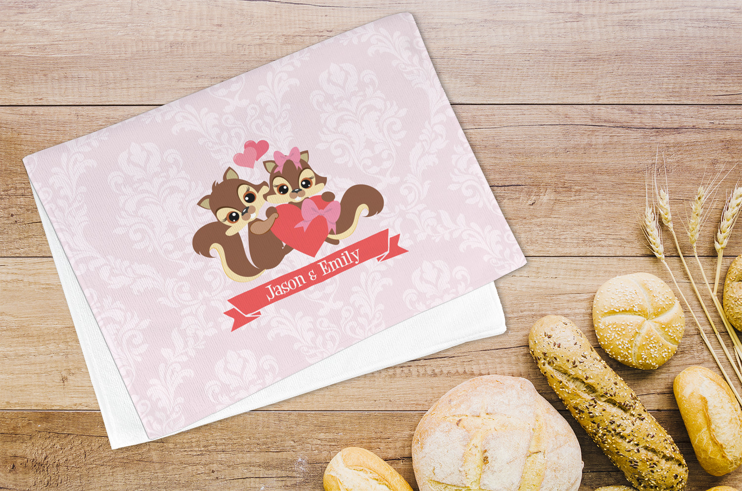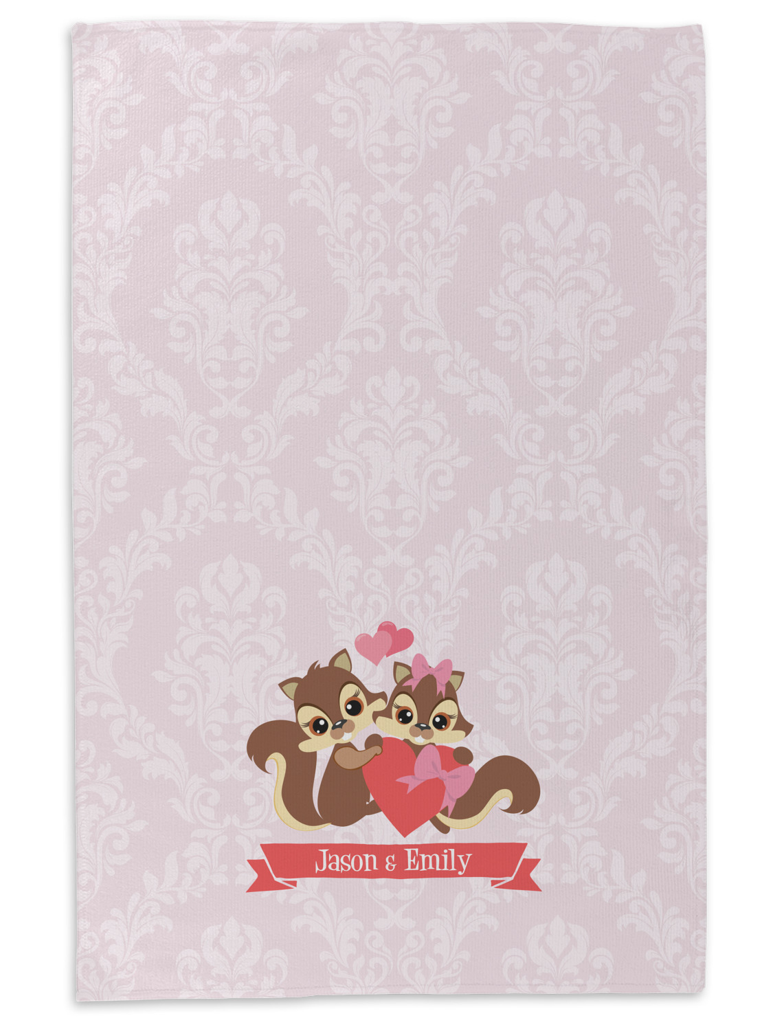 This Raccoon Couple Design is perfect for Valentine's Day or even for a newly engaged or married couple. It features a damask background in light pink with a raccoon couple in front holding hearts. The female has a bow on her head. There is a ribbon under the couple that can be customized with the couples names or even Mr. & Mrs. Your Text.