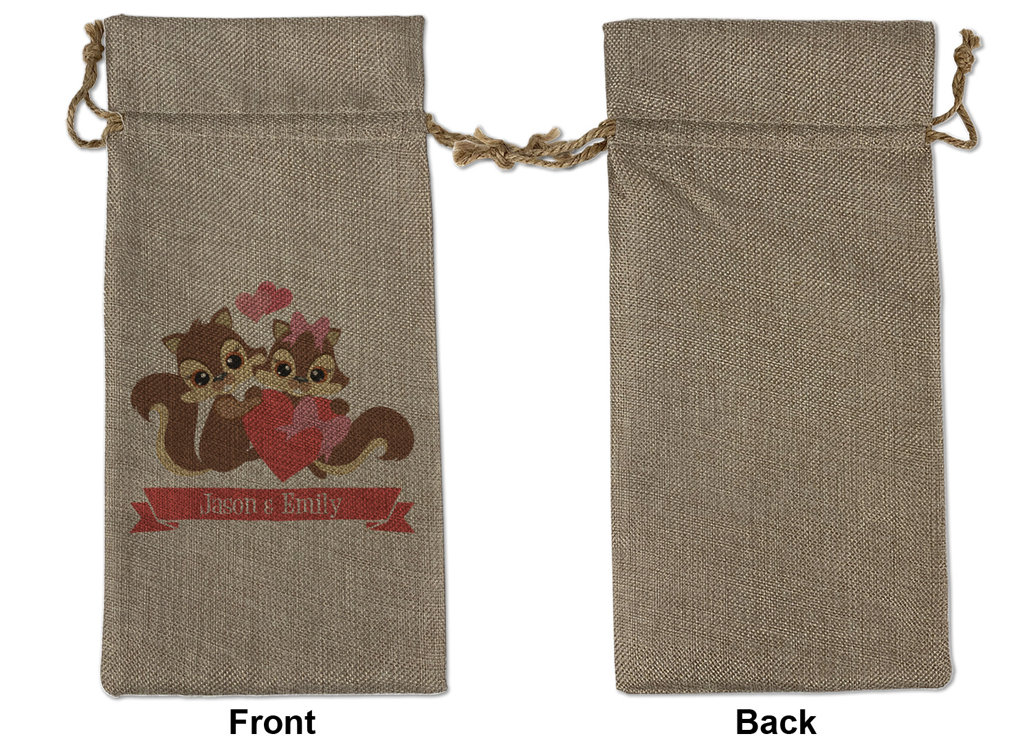 We sell our Burlap Gift Bags in 3 variant sized bags. Made with burlap polyester, each personalized bag can be secured with a twine drawstring pull. Your custom design is available to print on one side or both sides - completely up to you! The sizes of the bags measure approximately 4.5" x 6.5" for the smallest size, 6.5" x 8.0" for the medium size, and 6.5" x 13.5" for the large-sized bag.