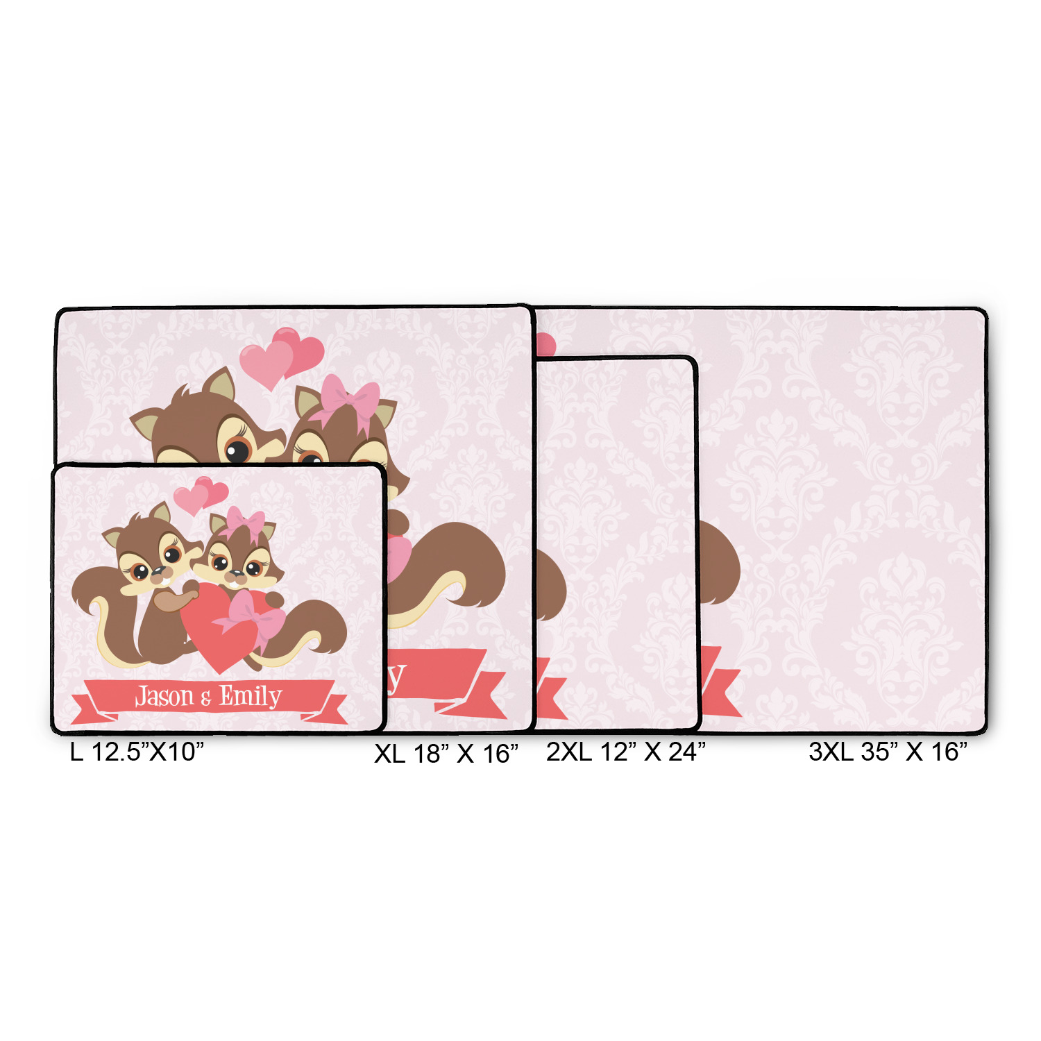 This Raccoon Couple Design is perfect for Valentine's Day or even for a newly engaged or married couple. It features a damask background in light pink with a raccoon couple in front holding hearts. The female has a bow on her head. There is a ribbon under the couple that can be customized with the couples names or even Mr. & Mrs. Your Text.